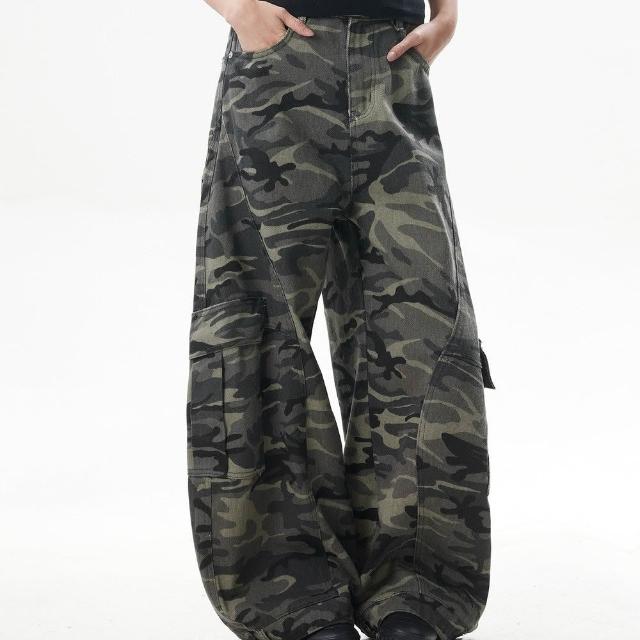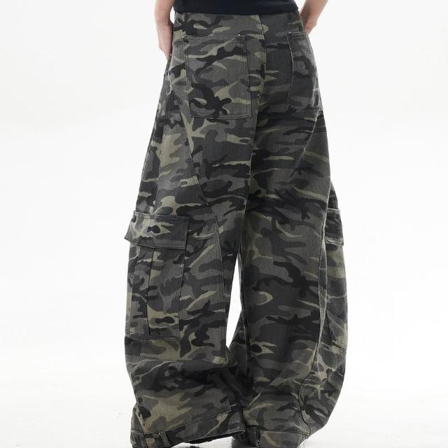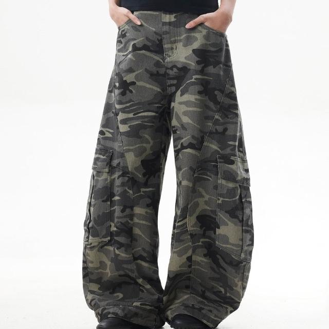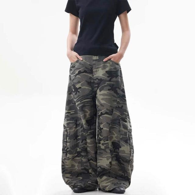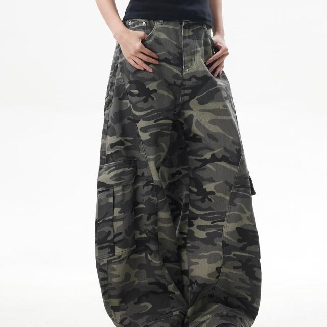 MAT RETRO美式復古迷彩闊腿工裝褲女潮牌寬鬆反穿設計感彎刀牛仔褲