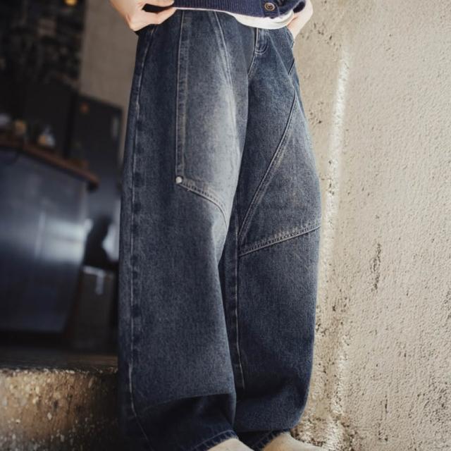 MAT RETRO美式復古水洗拼接寬鬆闊腿顯瘦香蕉鐮彎刀工裝牛仔褲子女士秋