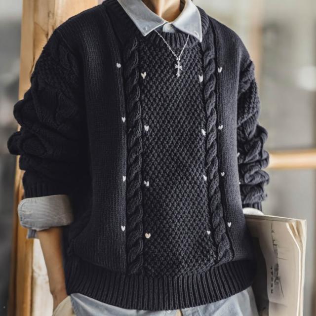 MAT RETRO藍色圓領寬鬆加厚保暖套頭外穿粗麻花毛線針織上毛衣女士秋冬