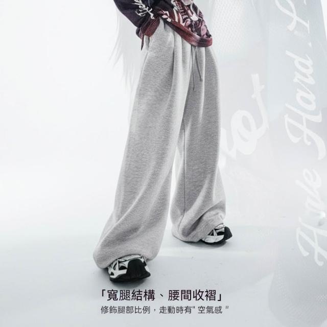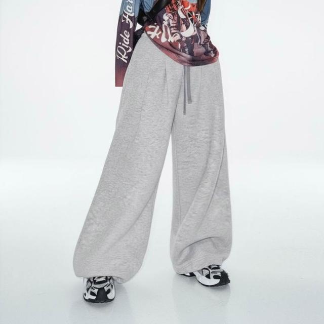 MAT RETRO淺灰色闊腿直筒休閒長衛褲鬆緊腰抽繩束脚垂墜感糯米褲子女冬