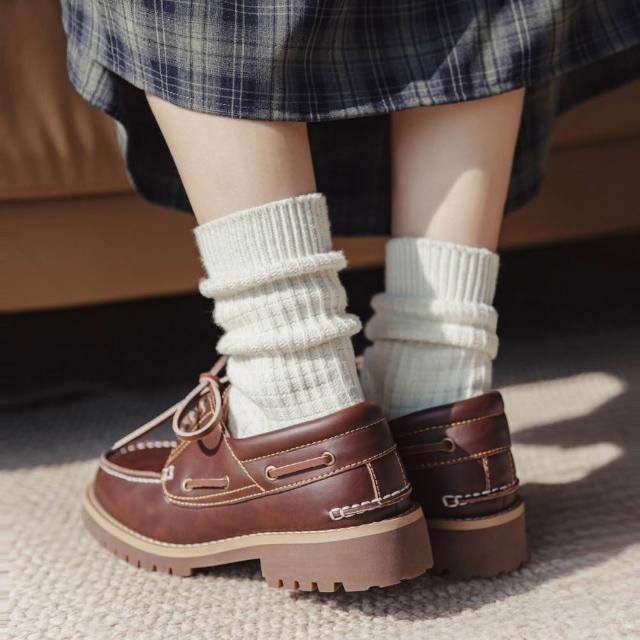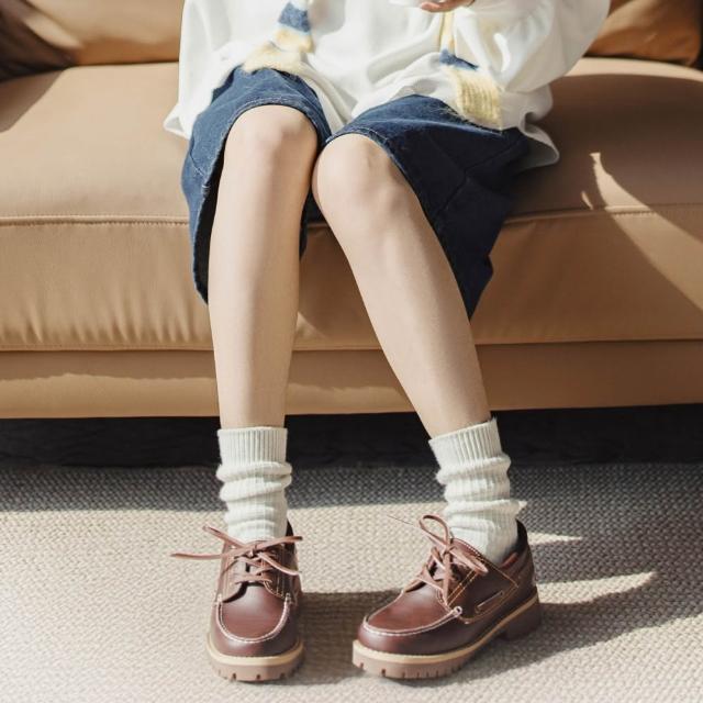 MAT RETRO復古紅棕色老錢風系帶圓頭平底樂福鞋帆船鞋真牛皮單鞋女秋冬