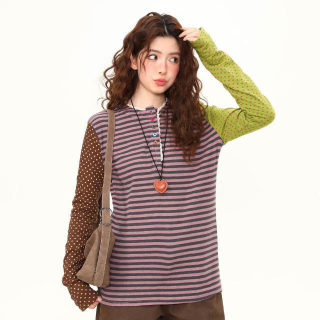 MAT RETRO春季新款拼接設計感波點蕾絲花邊長袖T恤女短寬鬆百搭tee