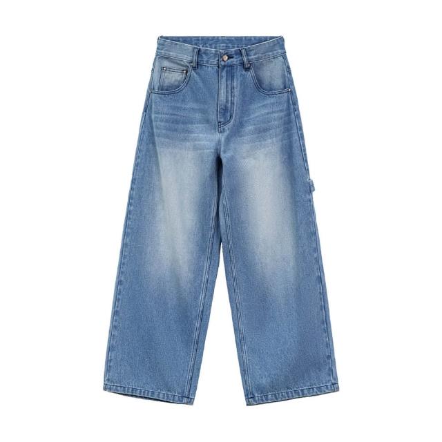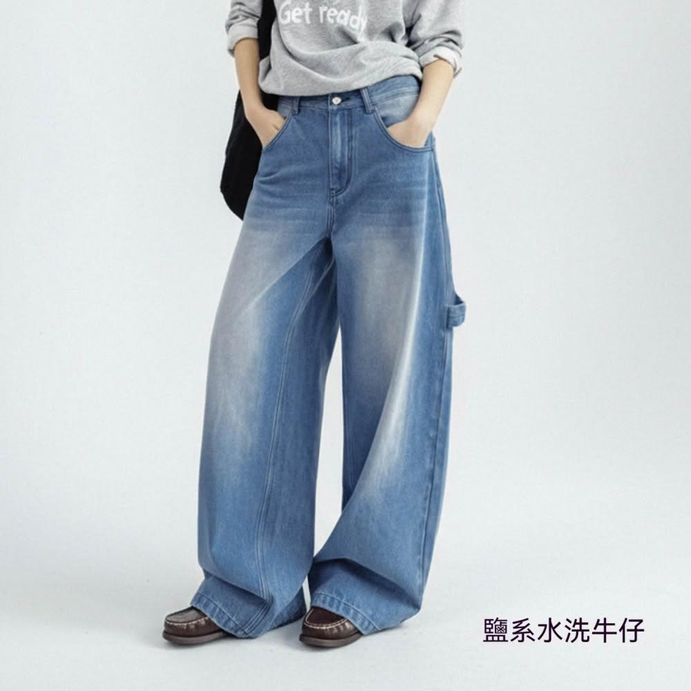 MAT RETRO淺藍色美式復古水洗做舊寬鬆闊腿直筒牛仔褲拖地長褲子女士春