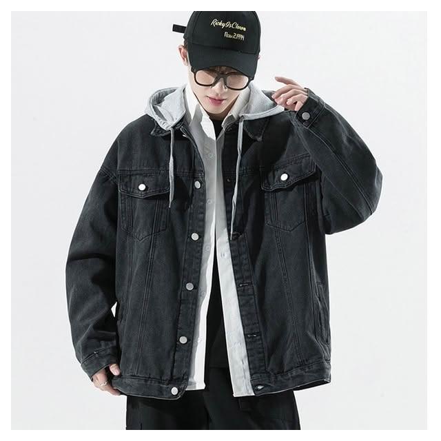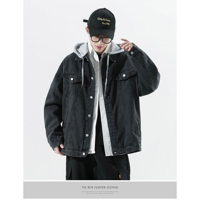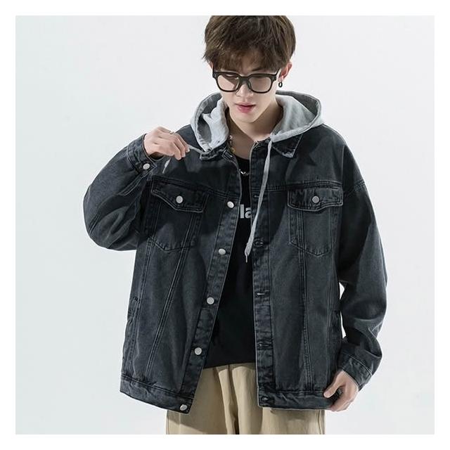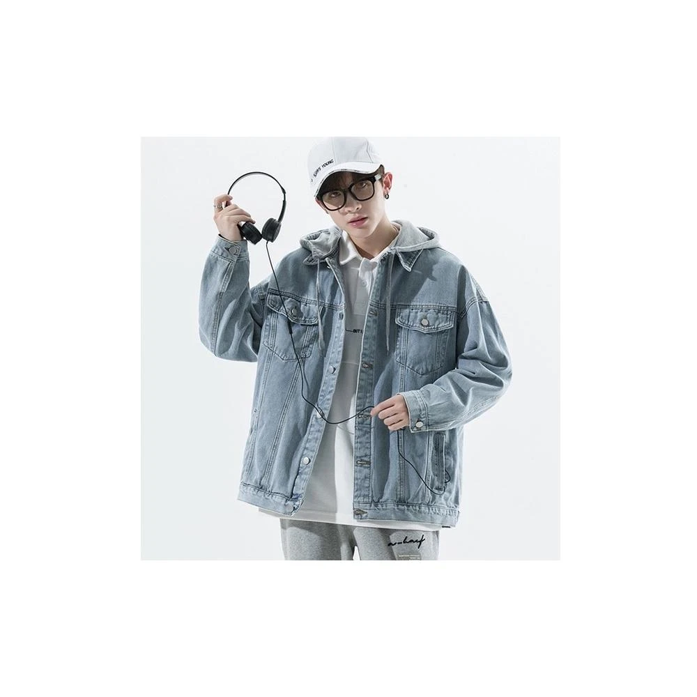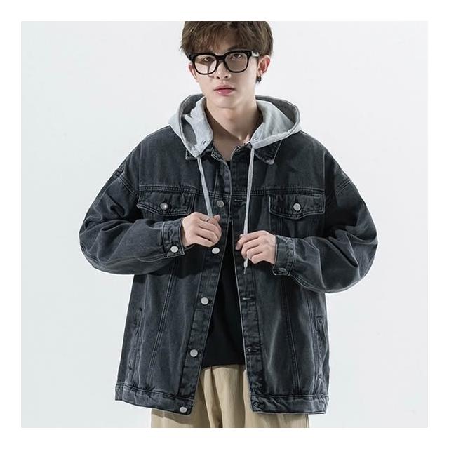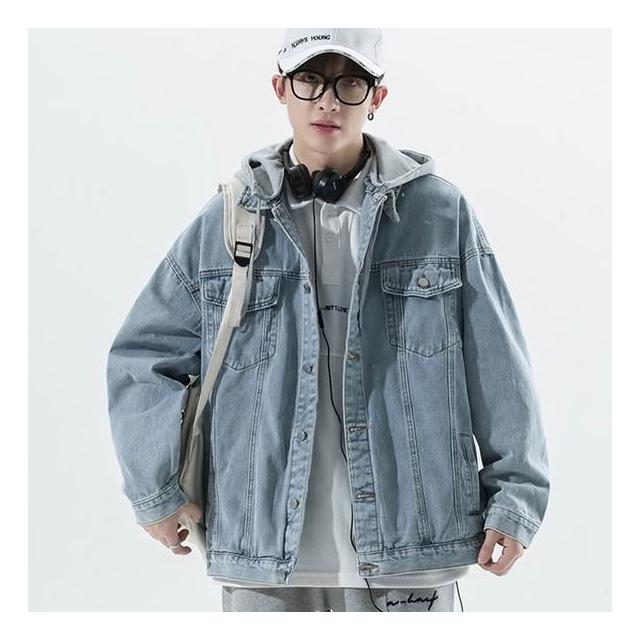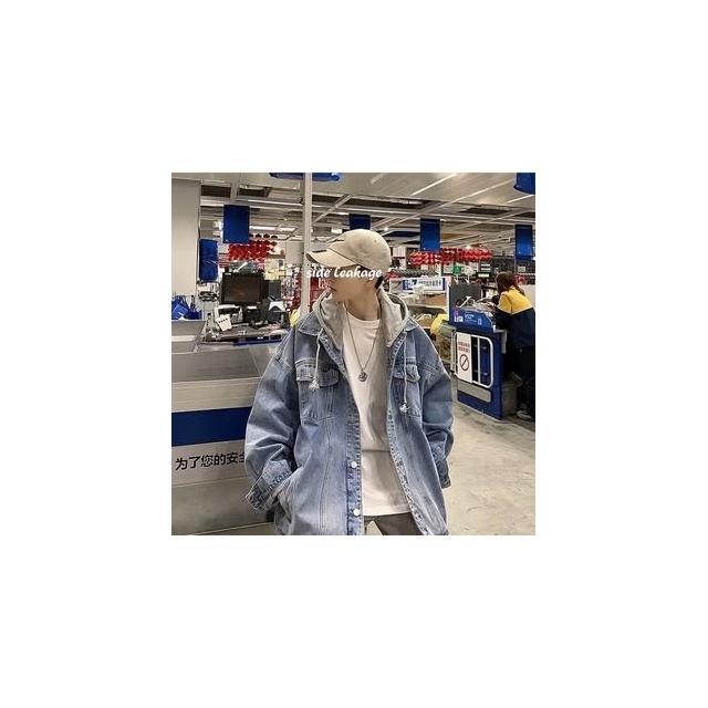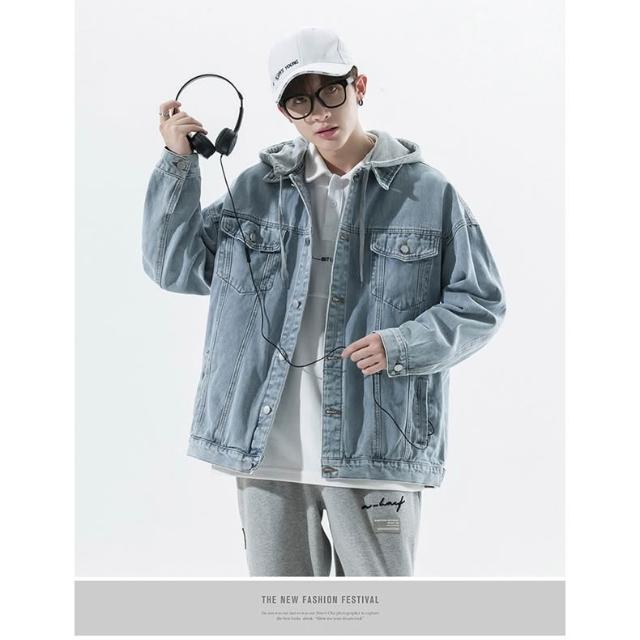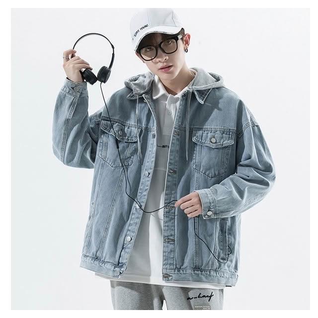 LARGE STORE 百搭款水洗刷破寬鬆版型設計連帽牛仔外套 牛仔夾克 男生外套 寬鬆外套 連帽外套(JK46)