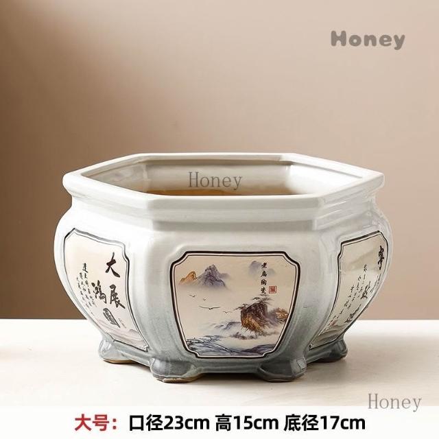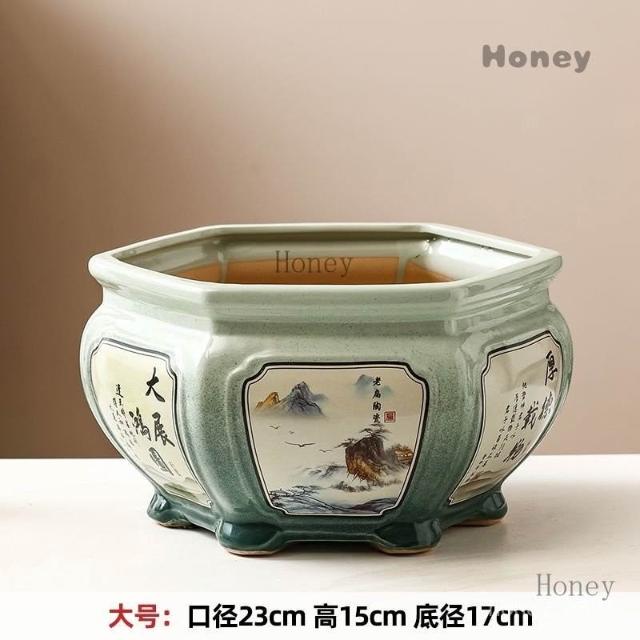 陶瓷花盆 大號中式複古手工彩繪客廳桌麵竹芋蕨類綠植六角形盆景盆