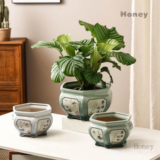 陶瓷花盆 大號中式複古手工彩繪客廳桌麵竹芋蕨類綠植六角形盆景盆