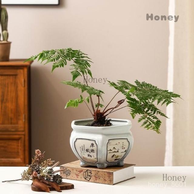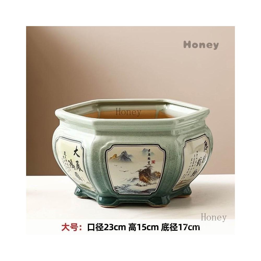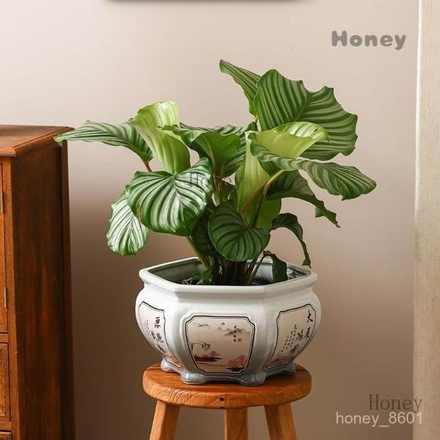 陶瓷花盆 大號中式複古手工彩繪客廳桌麵竹芋蕨類綠植六角形盆景盆