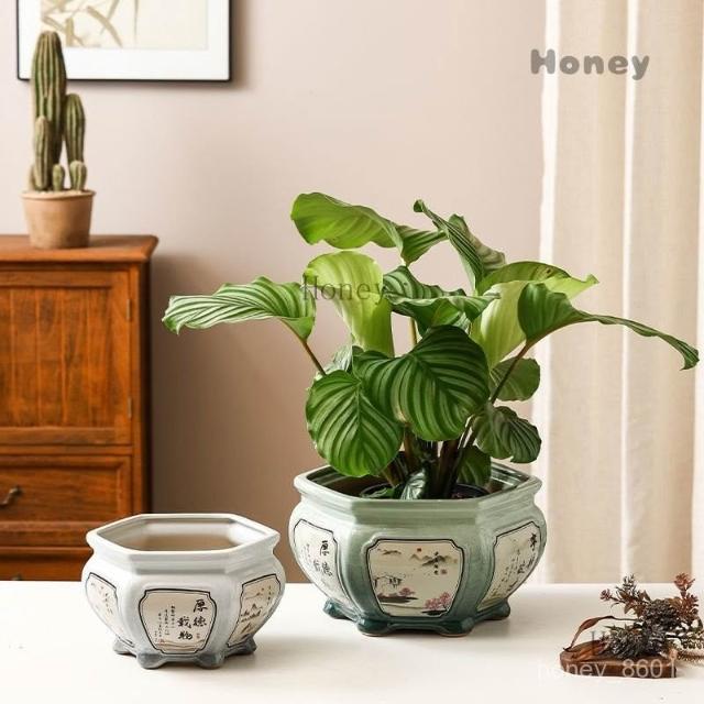 陶瓷花盆 大號中式複古手工彩繪客廳桌麵竹芋蕨類綠植六角形盆景盆