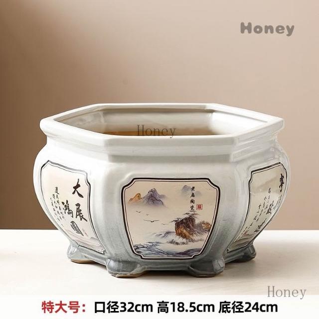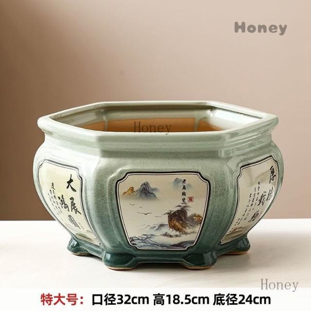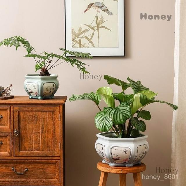 陶瓷花盆 大號中式複古手工彩繪客廳桌麵竹芋蕨類綠植六角形盆景盆