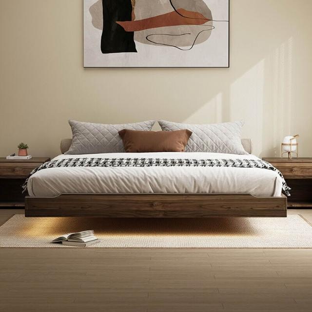 優選傢俱 免運費 黑胡桃木色榻榻米無床頭床懸浮床小戶型臥室日式中古風實木地臺床