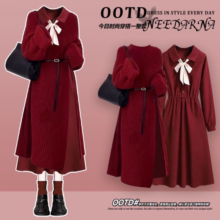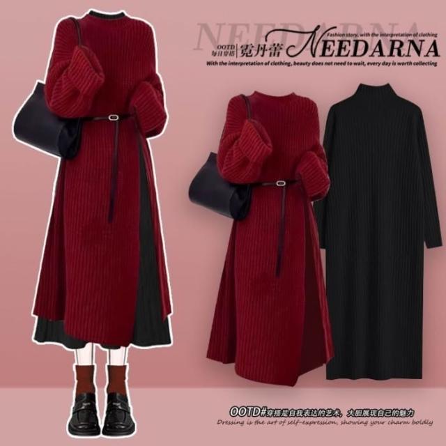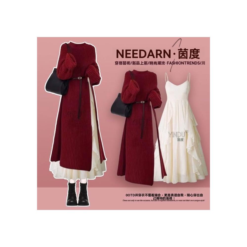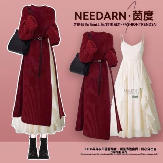 新年戰袍紅色毛衣止步長裙韓系高級感聖誕穿搭吊帶連衣裙兩件套女