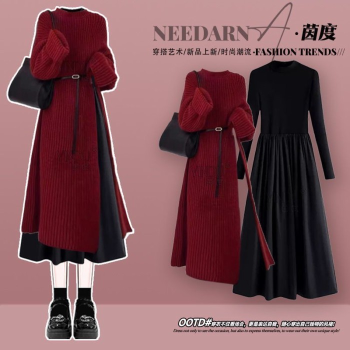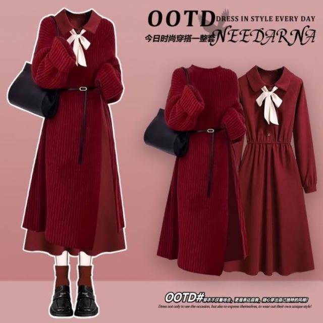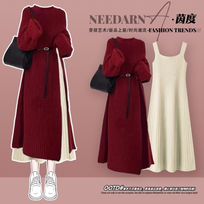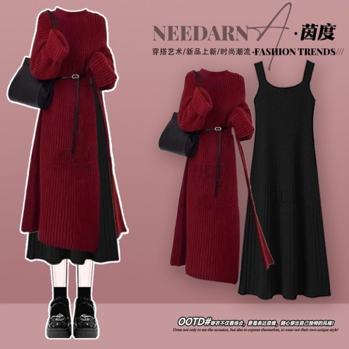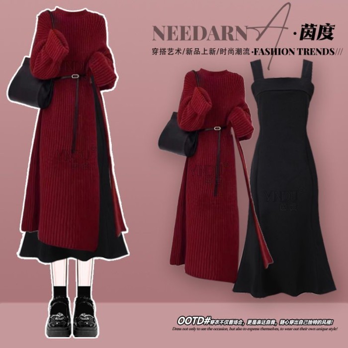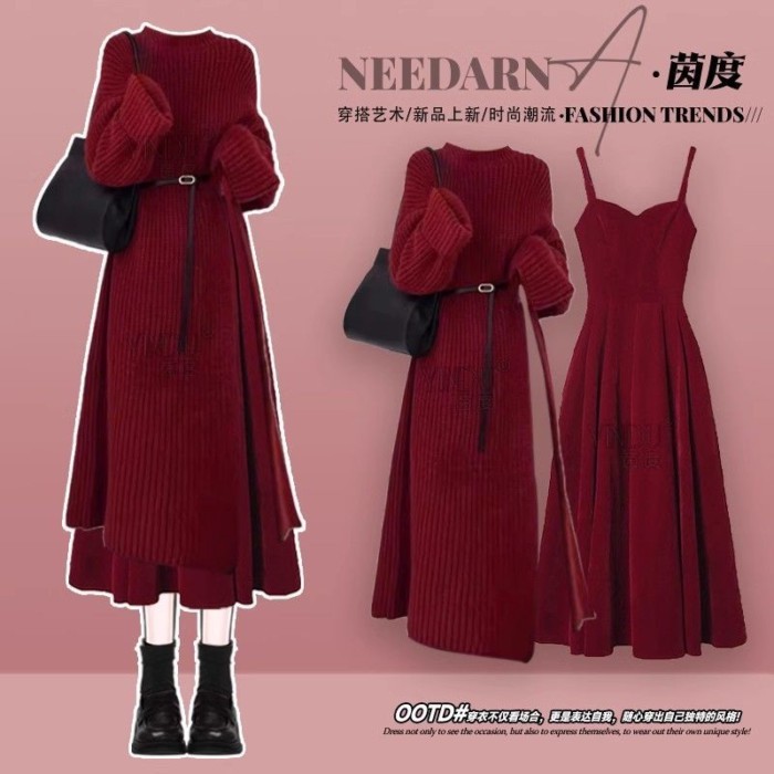新年戰袍紅色毛衣止步長裙韓系高級感聖誕穿搭吊帶連衣裙兩件套女
