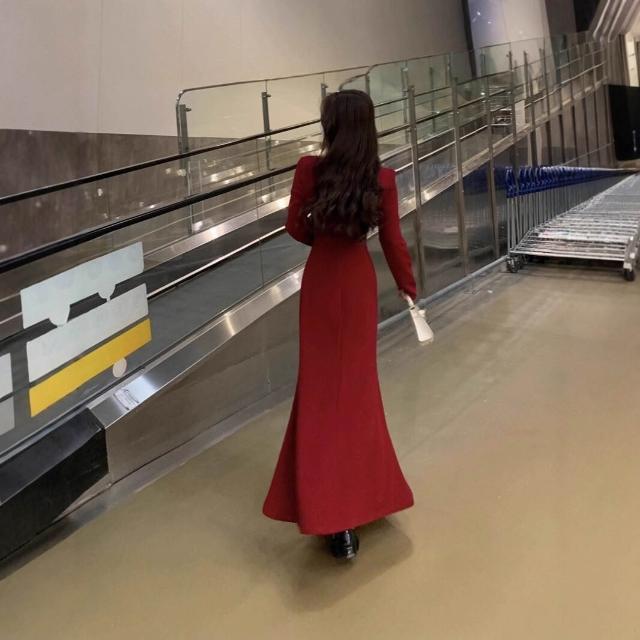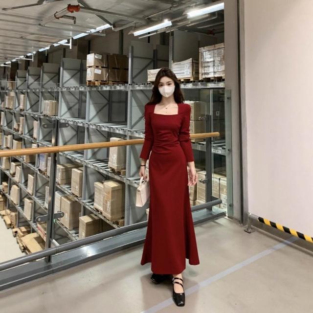 拾光衣櫥 港風復古紅色方領長袖連衣裙女2025秋優雅氣質法式收腰顯瘦長裙子