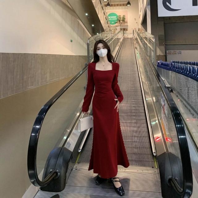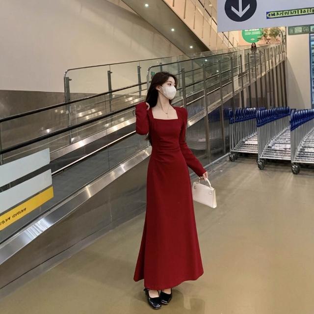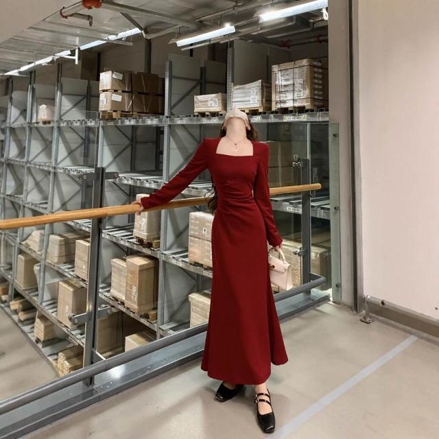 拾光衣櫥 港風復古紅色方領長袖連衣裙女2025秋優雅氣質法式收腰顯瘦長裙子