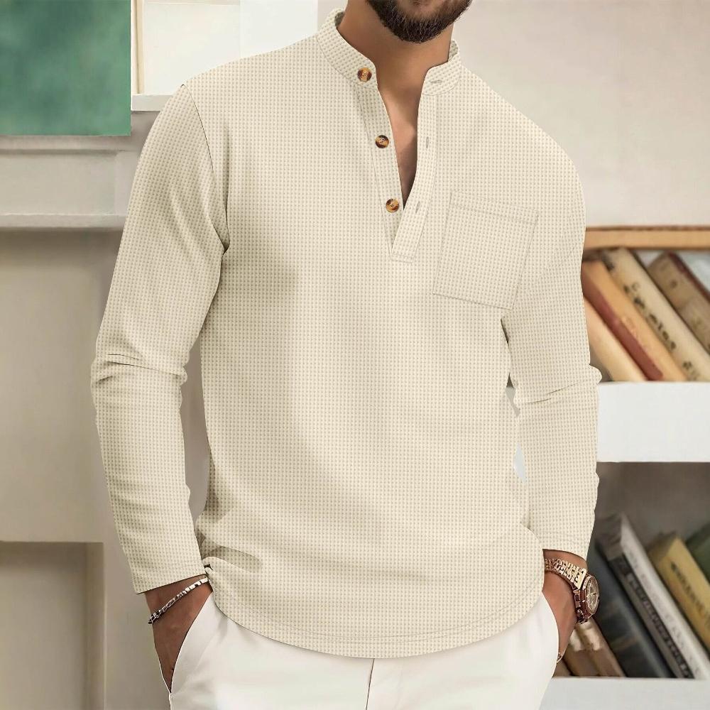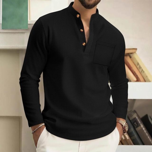 拾光衣櫥 春秋季男士新款 華夫格純色立領口袋長門襟扣子長袖POLO衫