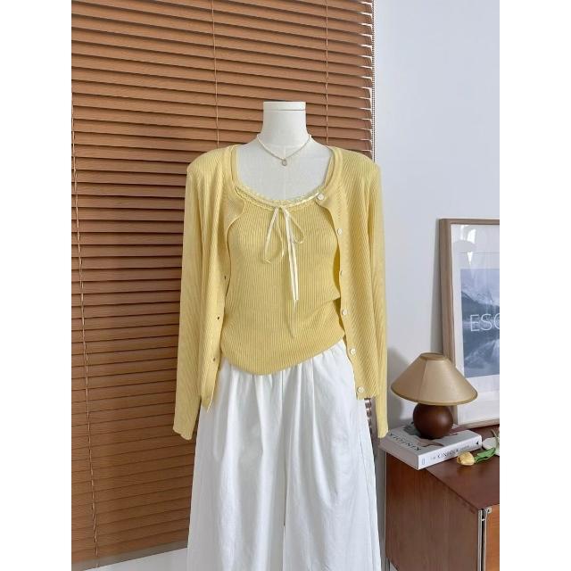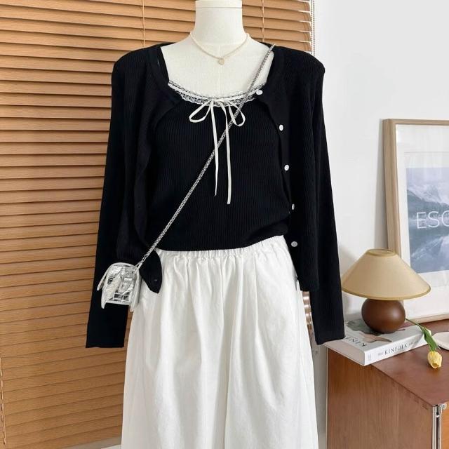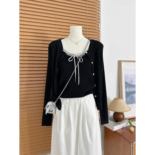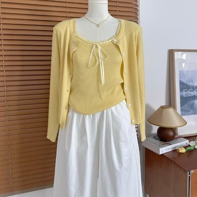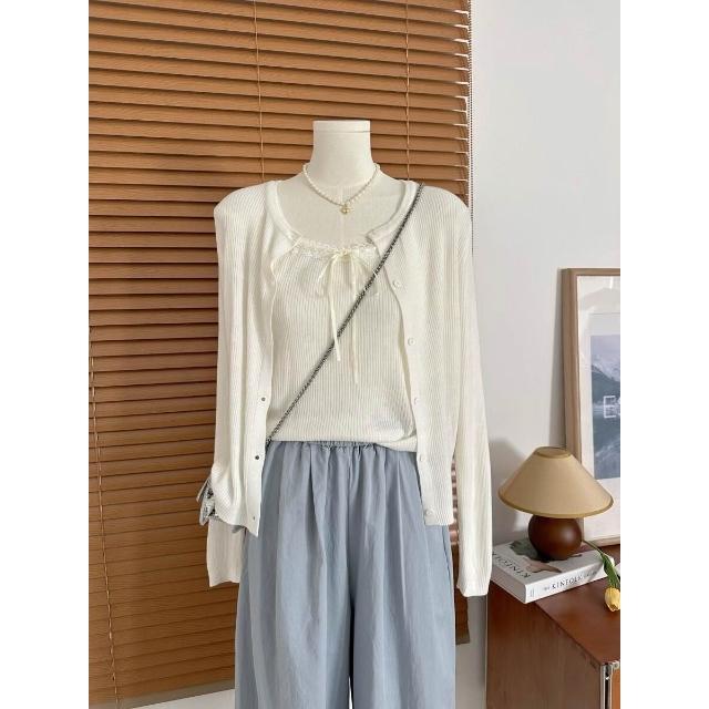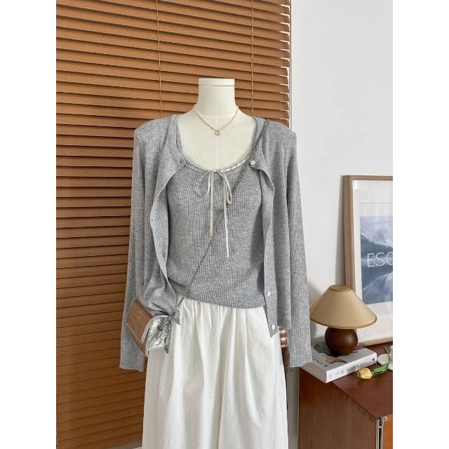 拾光衣櫥 早春韓系穿搭藍色蕾絲拼接吊帶背心女短款針織開衫別致絕美兩件套