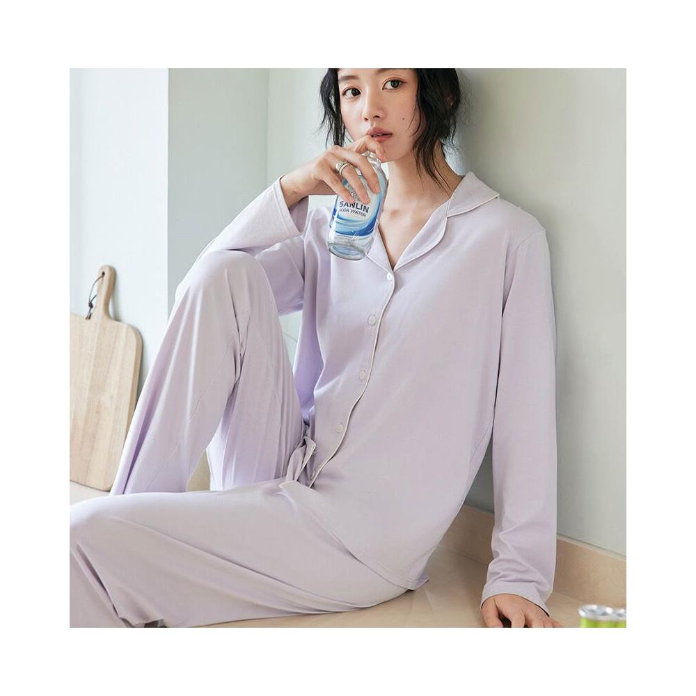 拾光衣櫥 春夏桑蠶絲家居服女2025新款紐扣寬松長袖睡衣純色外穿翻領套裝