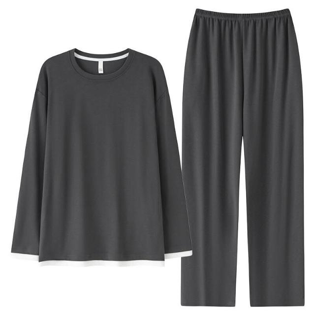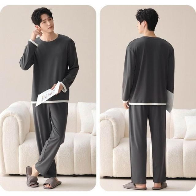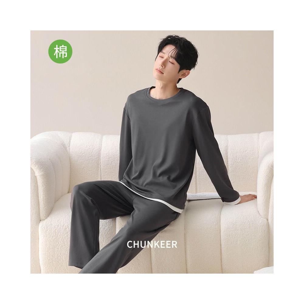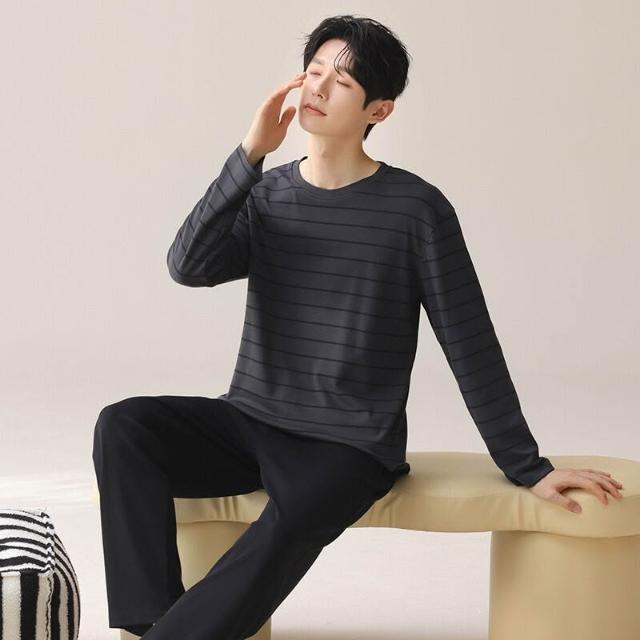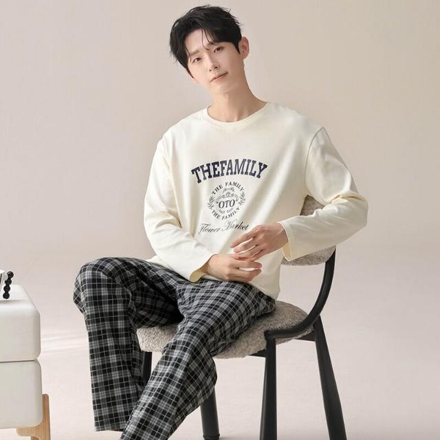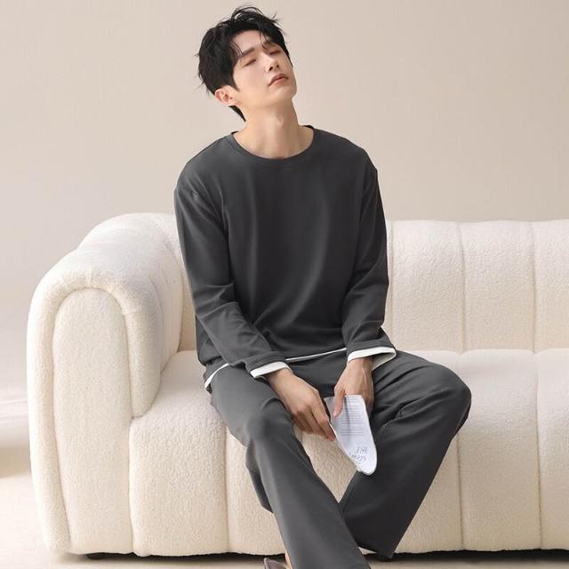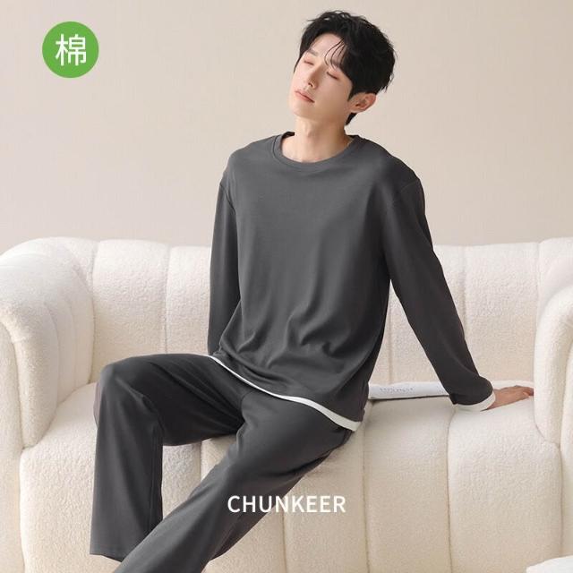 新品熱銷 100%純棉睡衣男春秋季可外穿長袖長褲套裝簡約全棉男士家居服