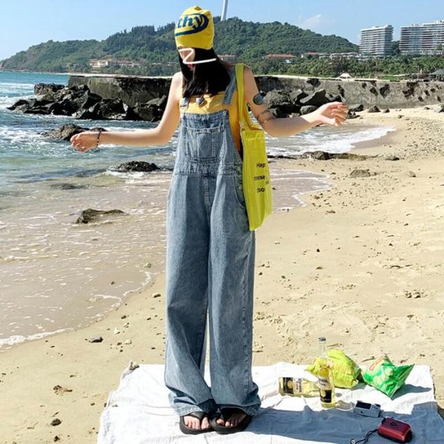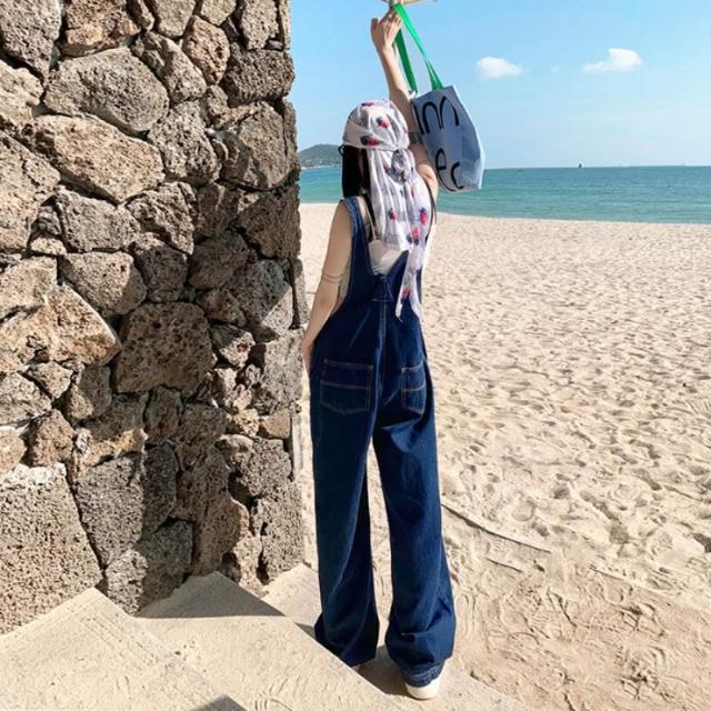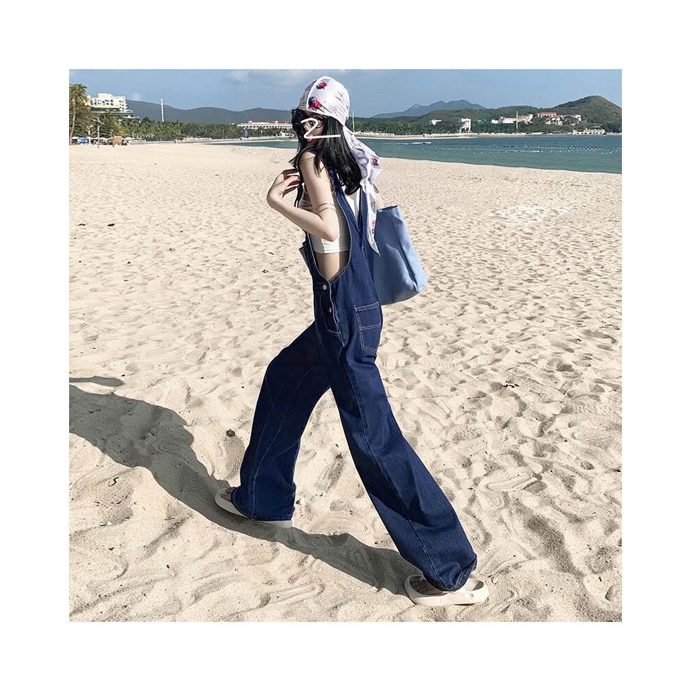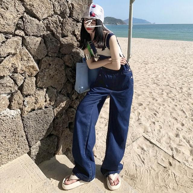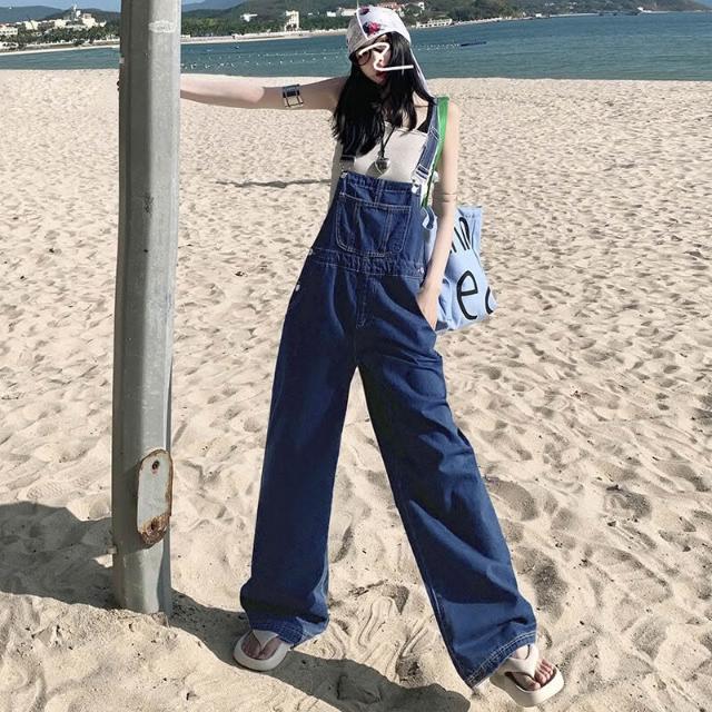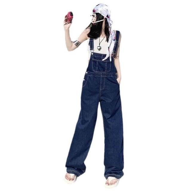 深藍色背帶褲女2025年春秋新款網紅韓版時尚寬松減齡闊腿牛仔褲女 拾光衣櫥