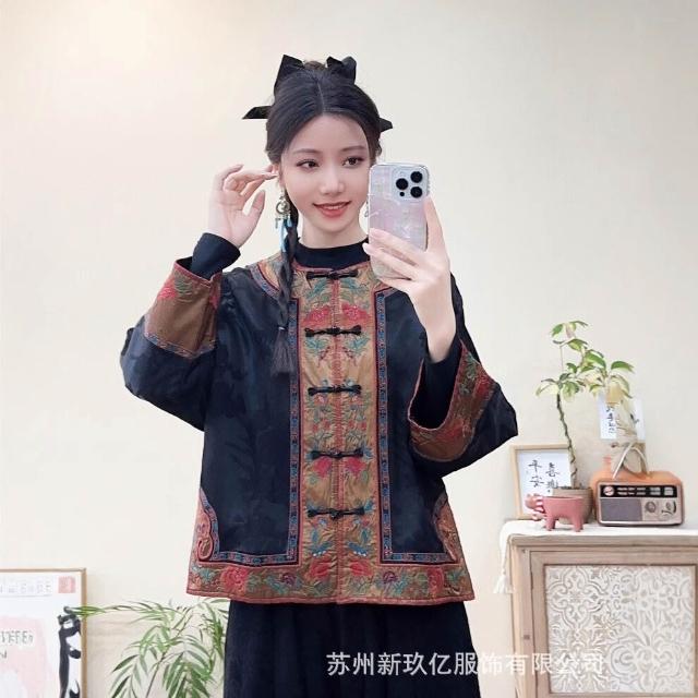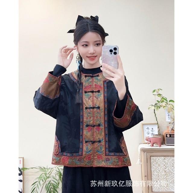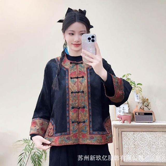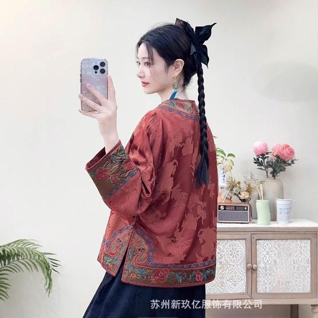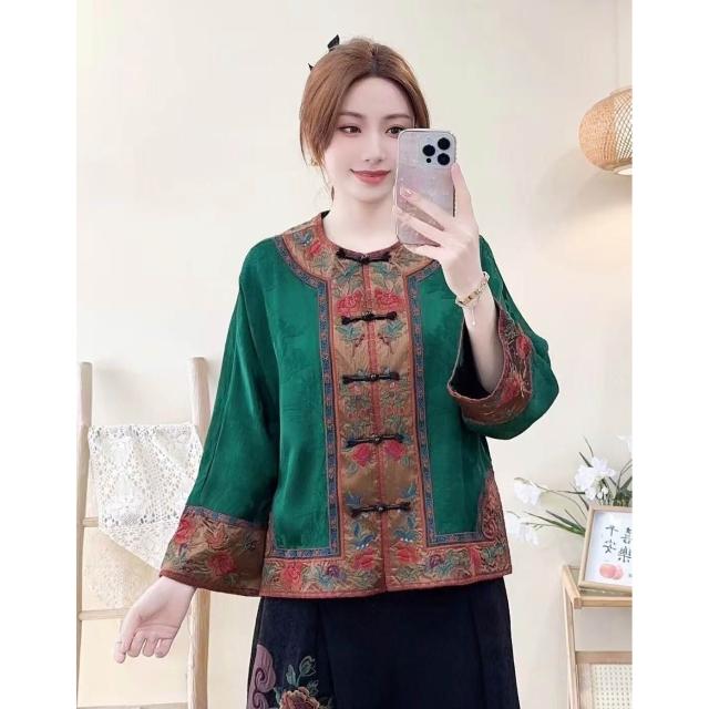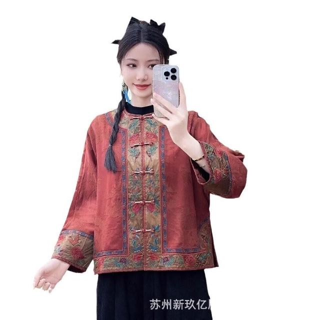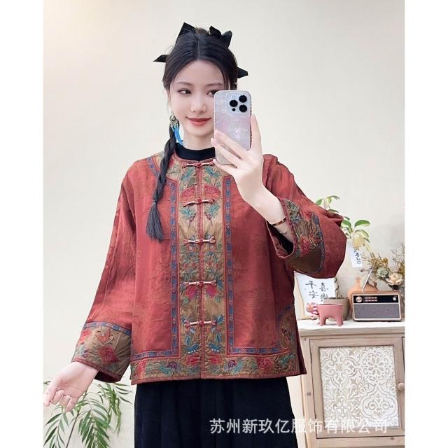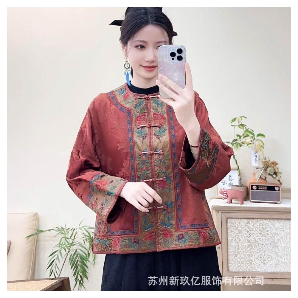 拾光衣櫥 春夏民族風復古重工刺繡緞面寬松提花外套女盤扣寬松長袖薄上衣
