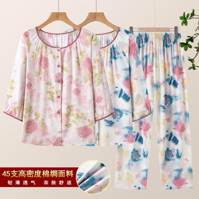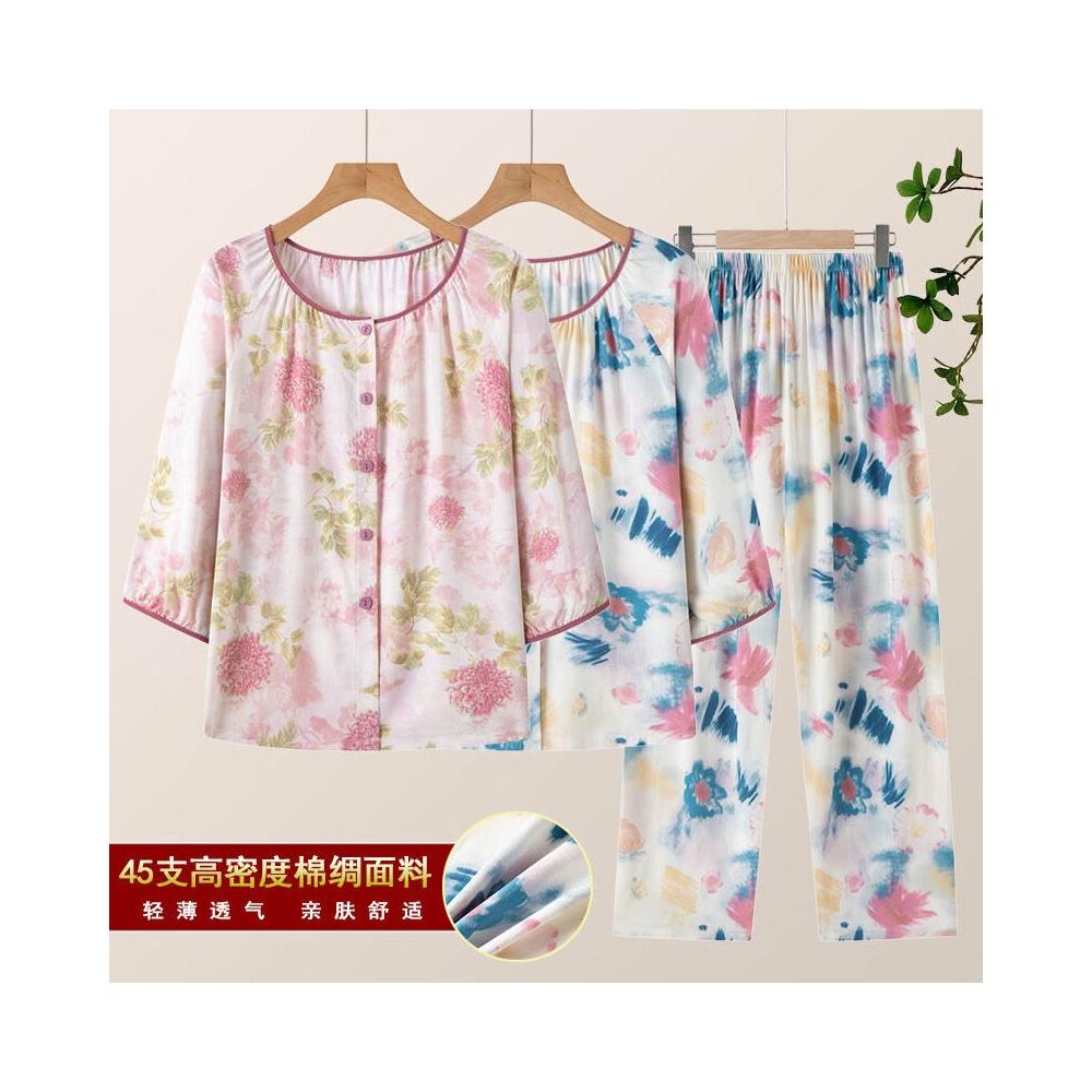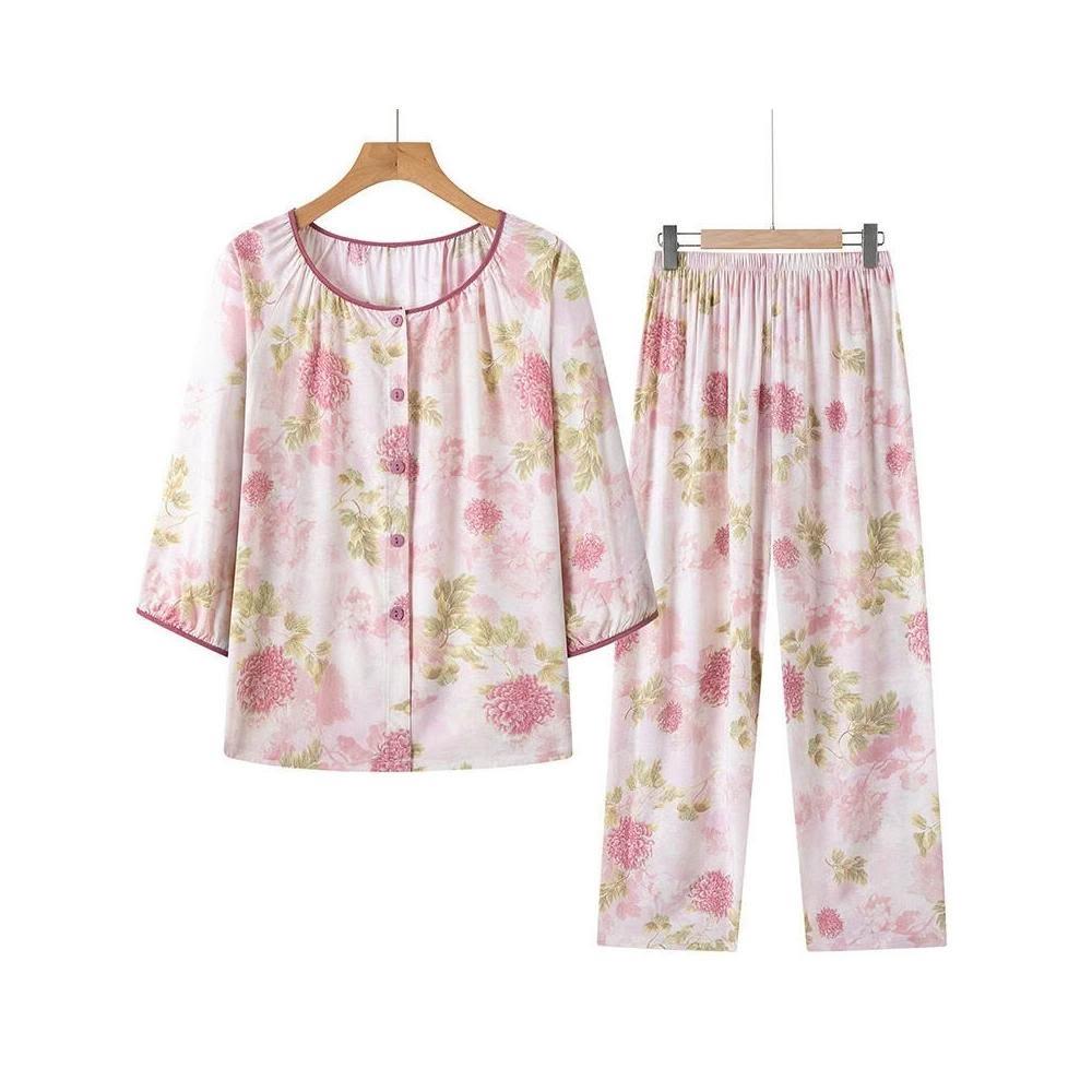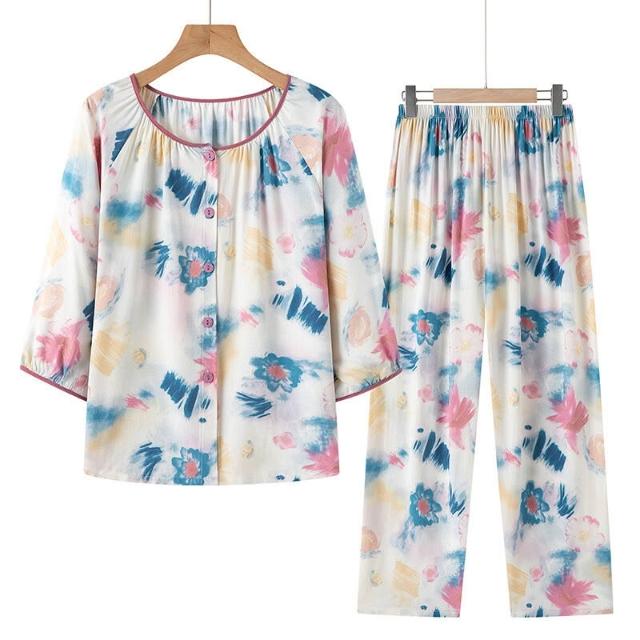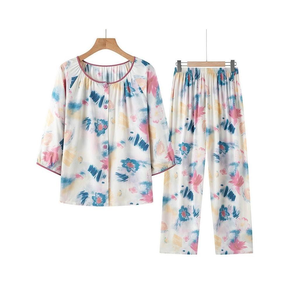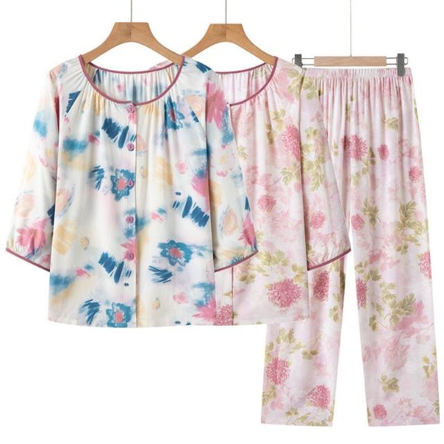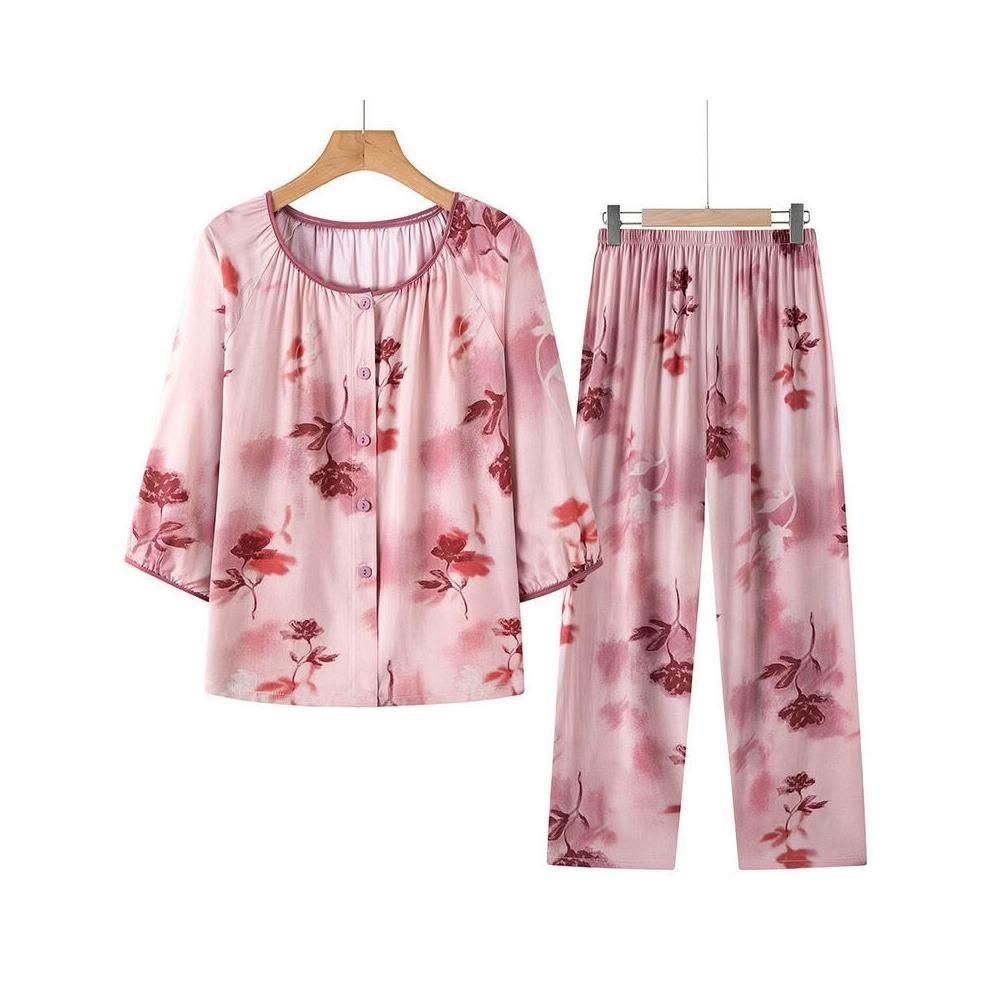新品熱銷 中老年媽媽夏天綿綢短袖套裝2025新款奶奶款冰涼透氣可外穿家居服