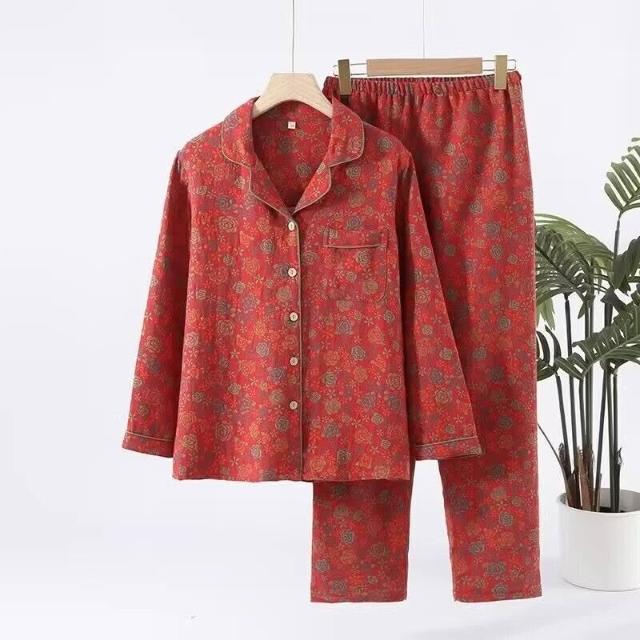 拾光衣櫥 復古印花睡衣女士春秋季色織純棉紗布雙層薄款寬松長袖家居服套裝