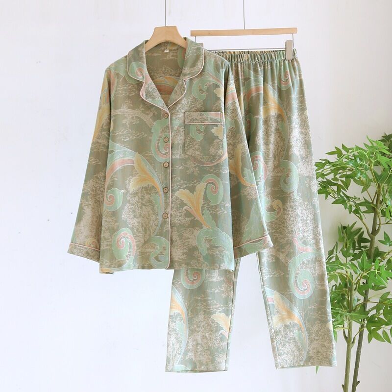 拾光衣櫥 復古印花睡衣女士春秋季色織純棉紗布雙層薄款寬松長袖家居服套裝
