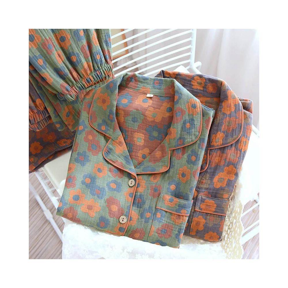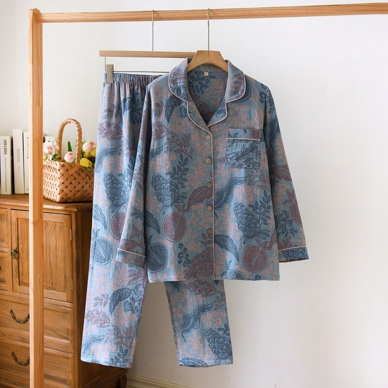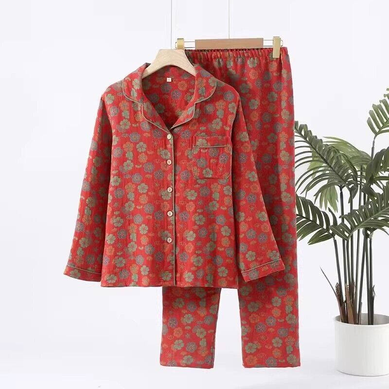拾光衣櫥 復古印花睡衣女士春秋季色織純棉紗布雙層薄款寬松長袖家居服套裝