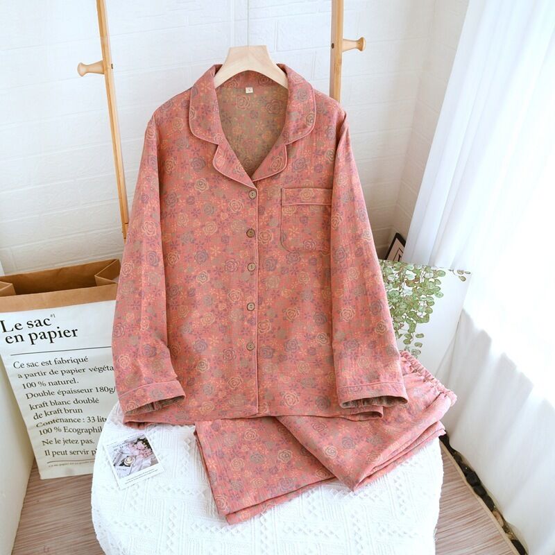 拾光衣櫥 復古印花睡衣女士春秋季色織純棉紗布雙層薄款寬松長袖家居服套裝