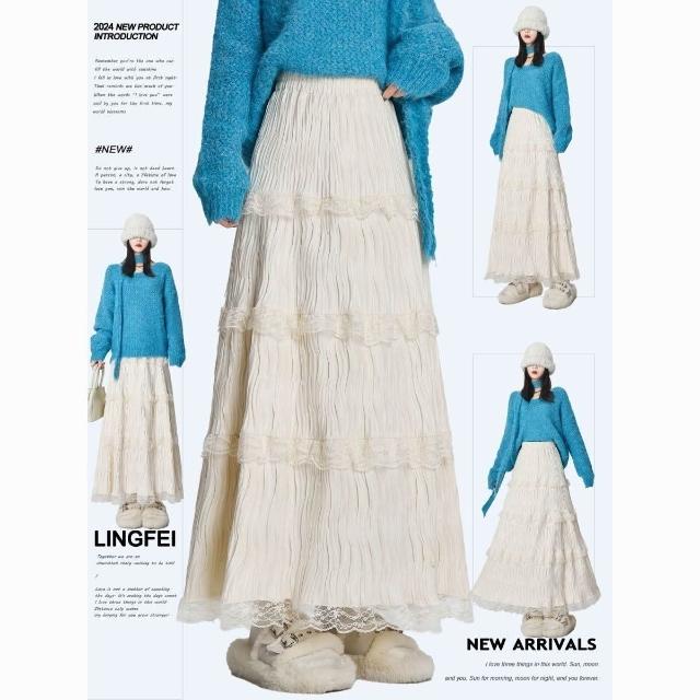 拾光衣櫥 白色蕾絲拼接絲絨半身裙女秋冬溫柔風仙女蛋糕裙松緊高腰a字長裙