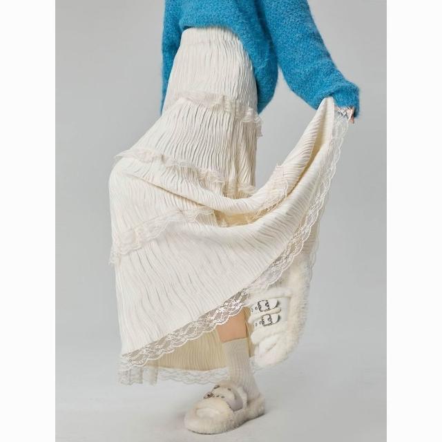 拾光衣櫥 白色蕾絲拼接絲絨半身裙女秋冬溫柔風仙女蛋糕裙松緊高腰a字長裙