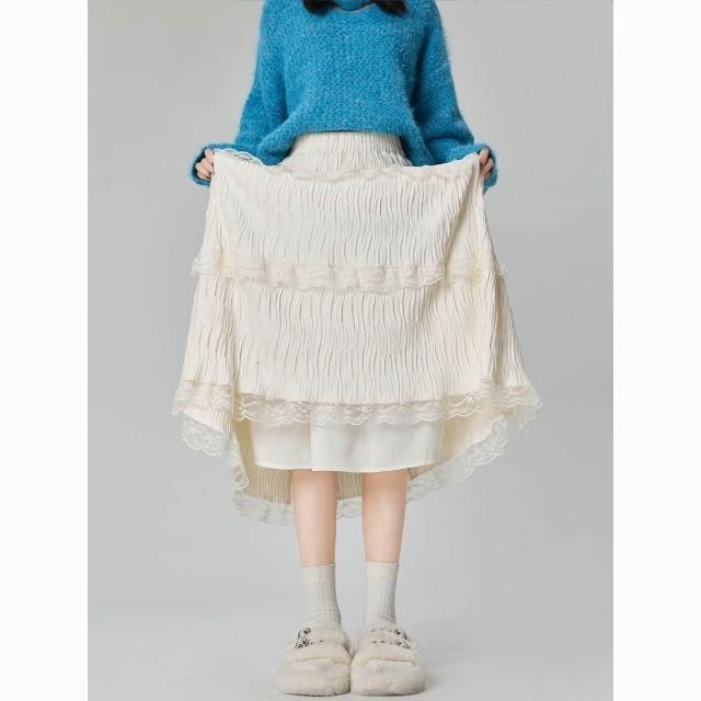 拾光衣櫥 白色蕾絲拼接絲絨半身裙女秋冬溫柔風仙女蛋糕裙松緊高腰a字長裙