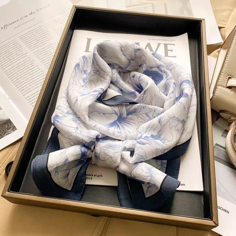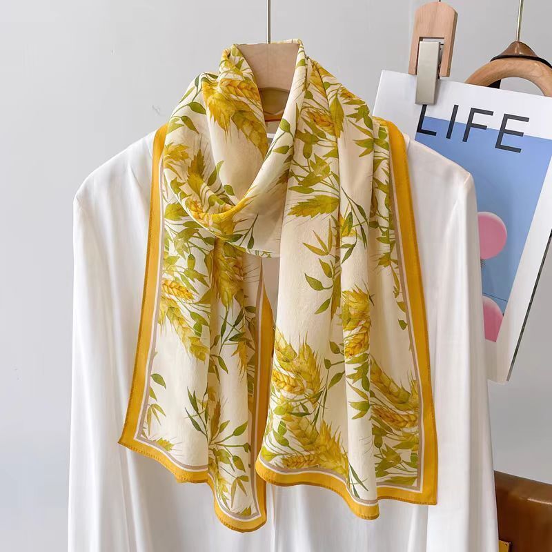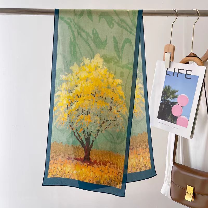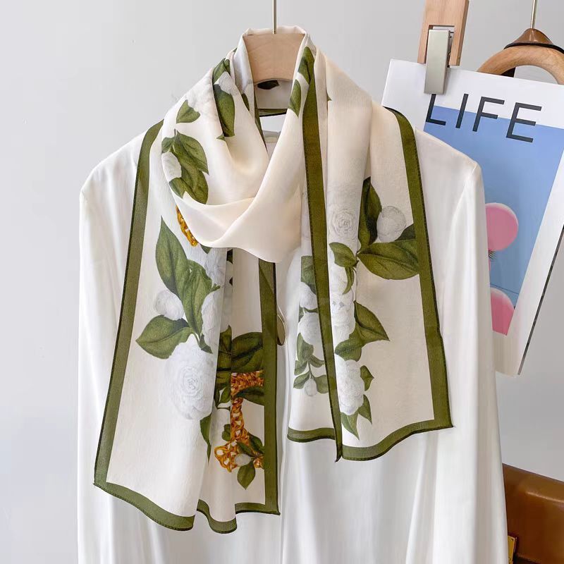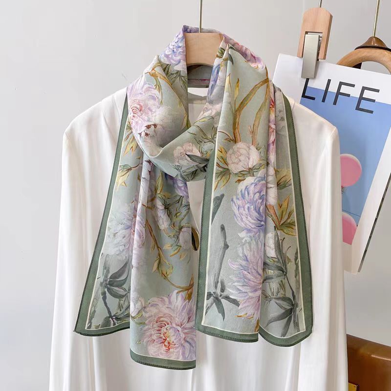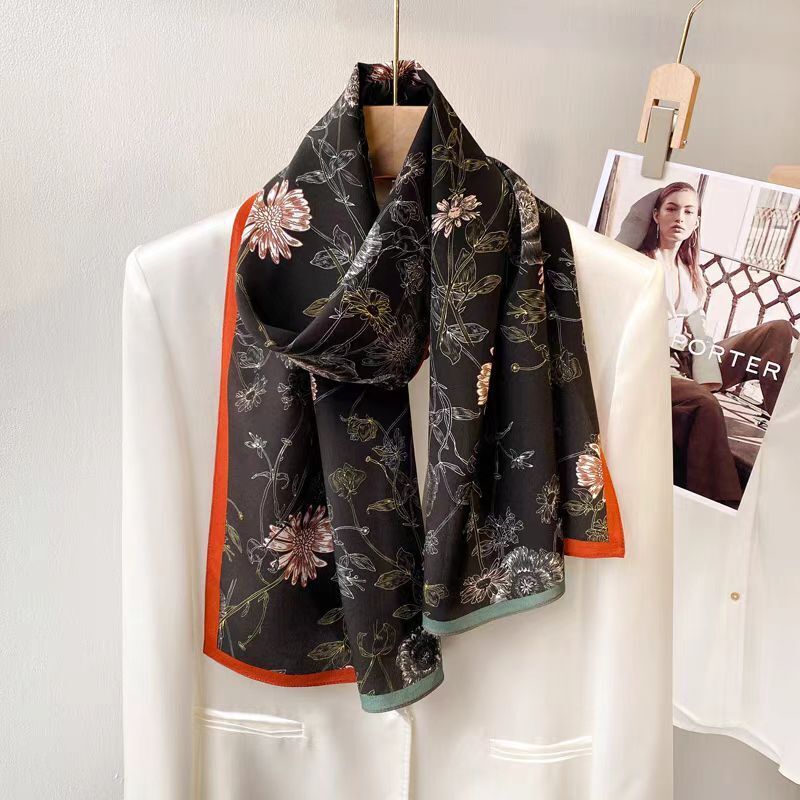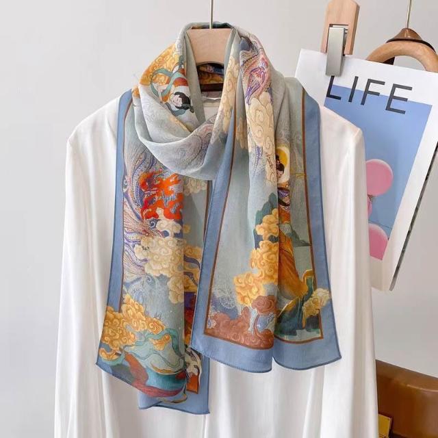 跨境新款絲巾數碼噴繪印花真絲圍巾女桑蠶絲雙绉真絲長款絲巾