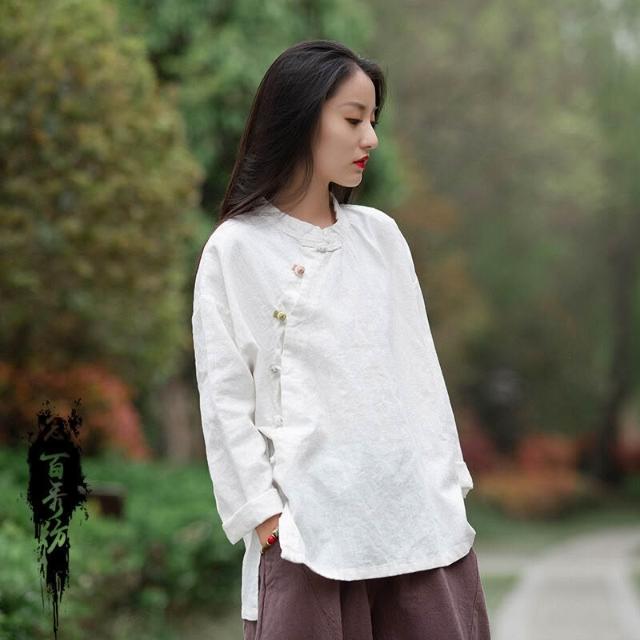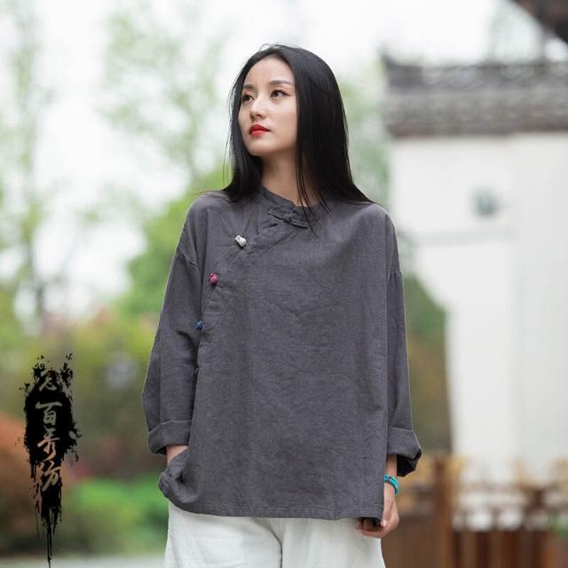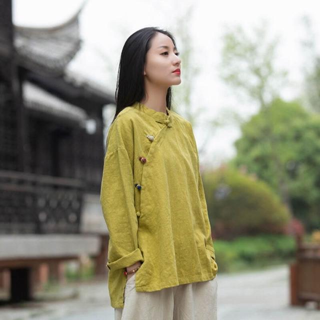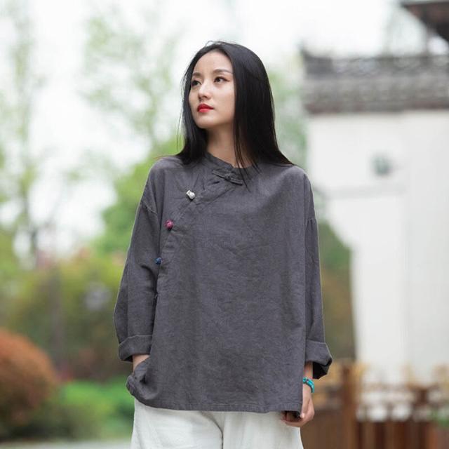 2026春季新款棉麻女裝復古立領偏襟拼色砂洗盤扣上衣長袖女式襯衫