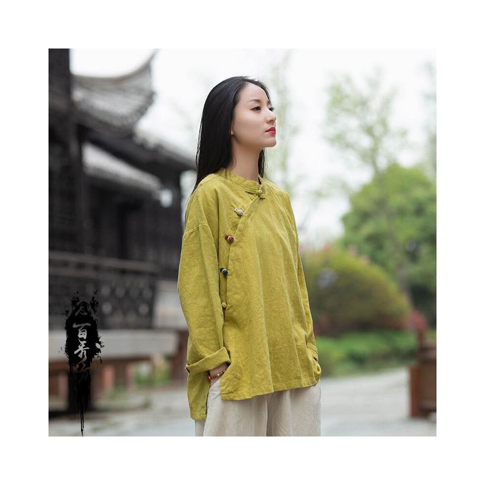 2026春季新款棉麻女裝復古立領偏襟拼色砂洗盤扣上衣長袖女式襯衫