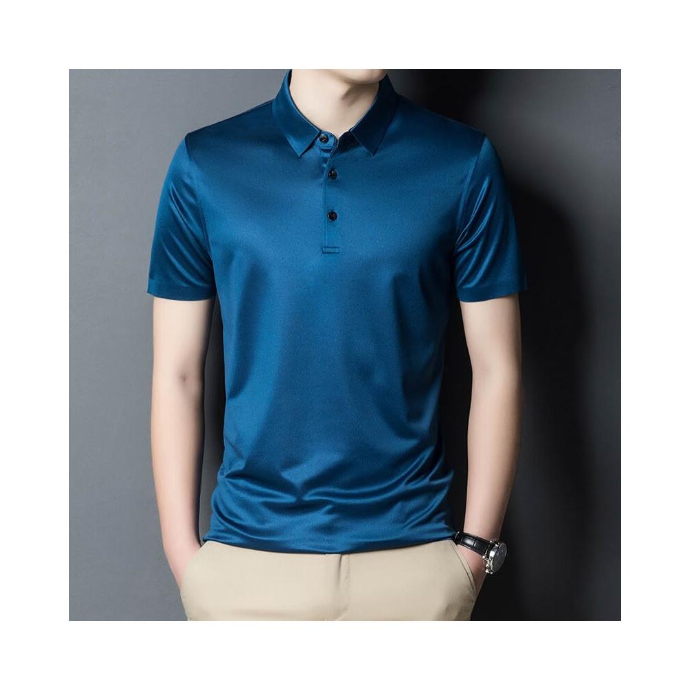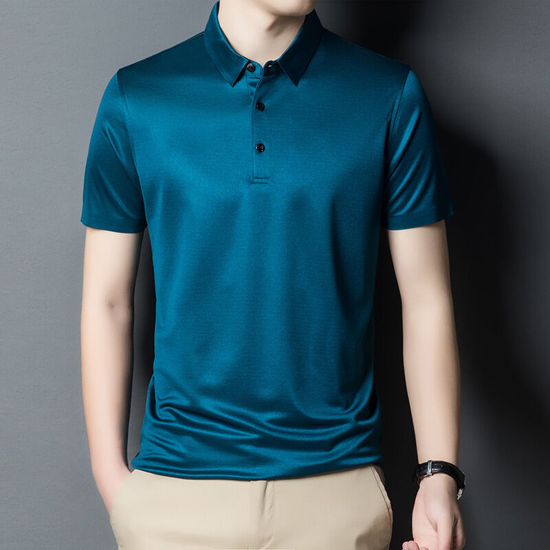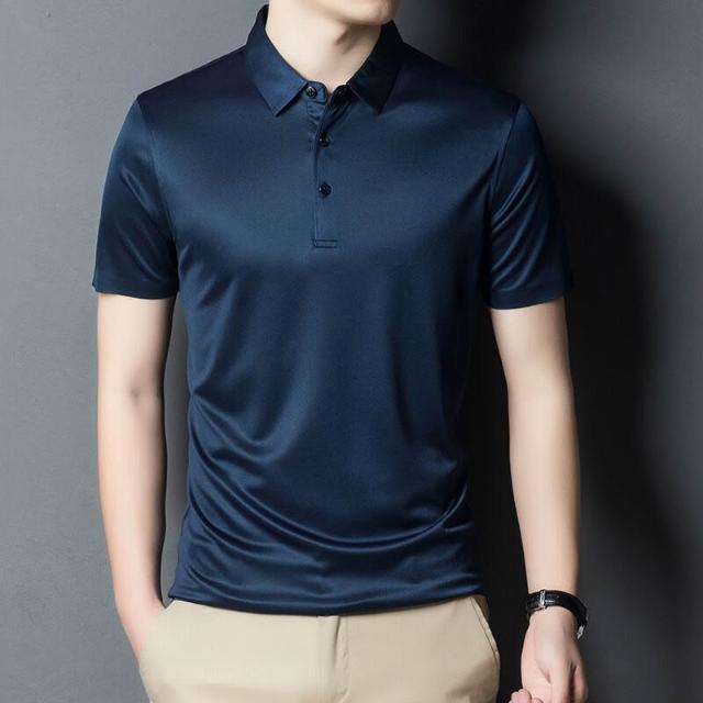 新款t恤男士桑蠶絲短袖夏季中青年純色翻領體恤休閑爸爸裝半袖衫