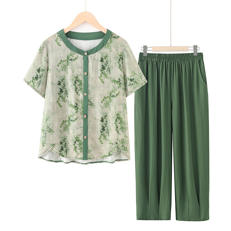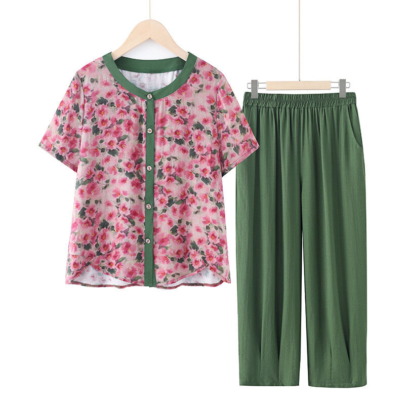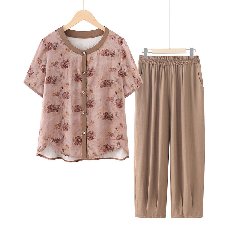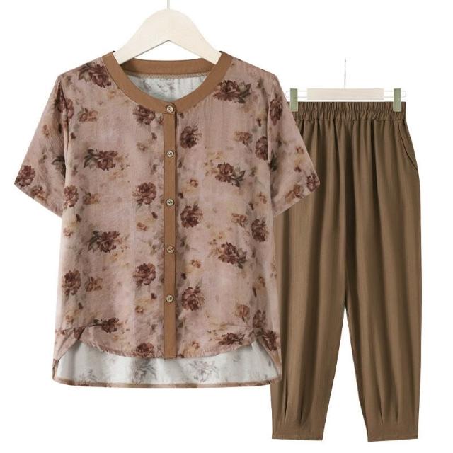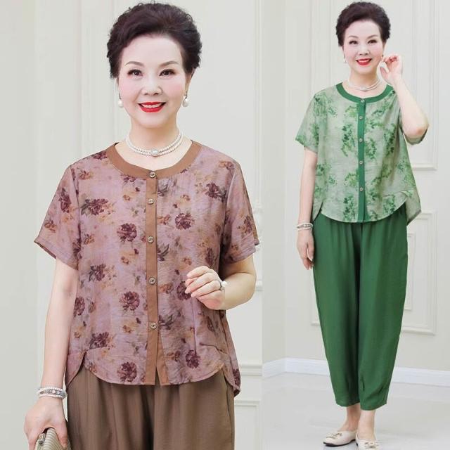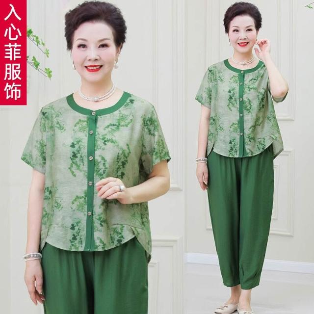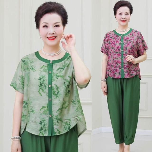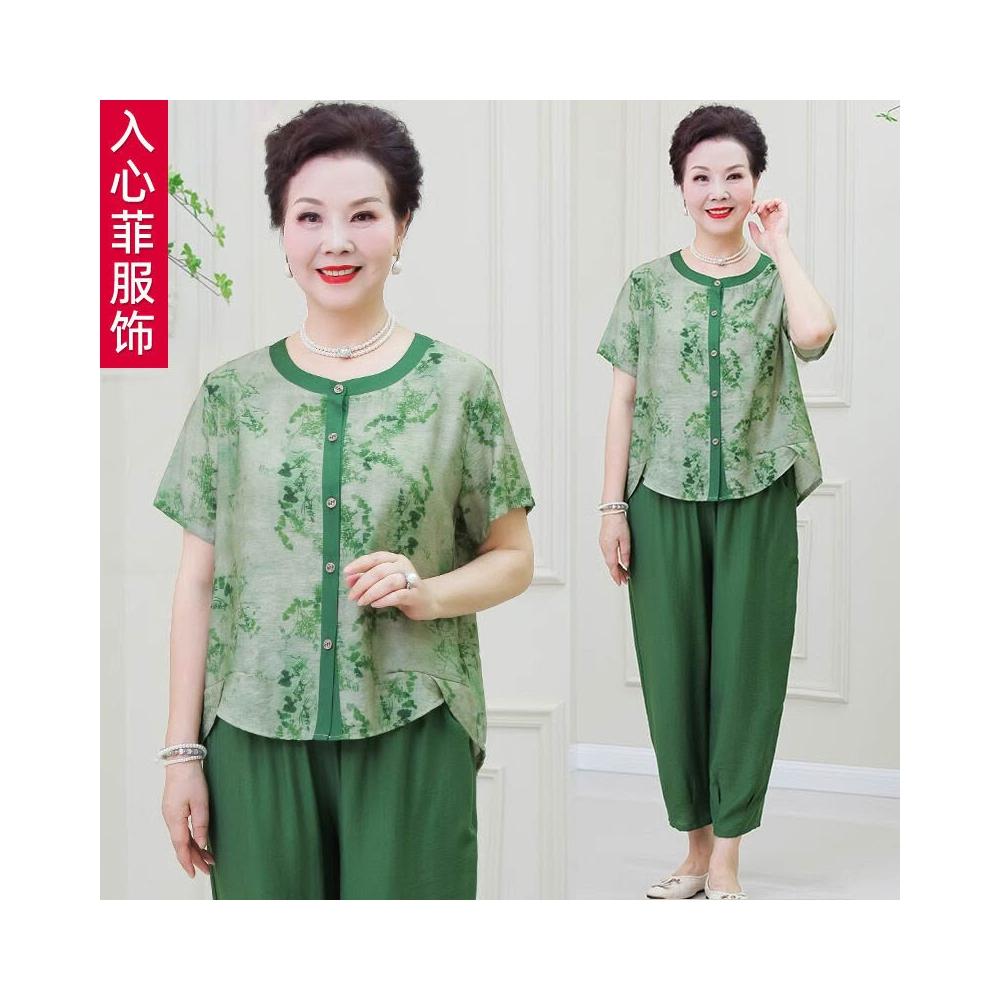 媽媽夏裝套裝短袖T恤小開衫薄上衣洋氣奶奶綿綢兩件中老年人女裝