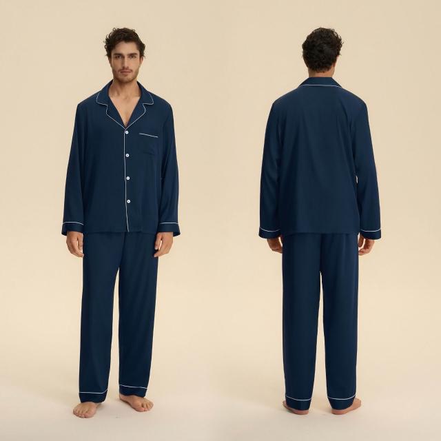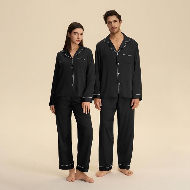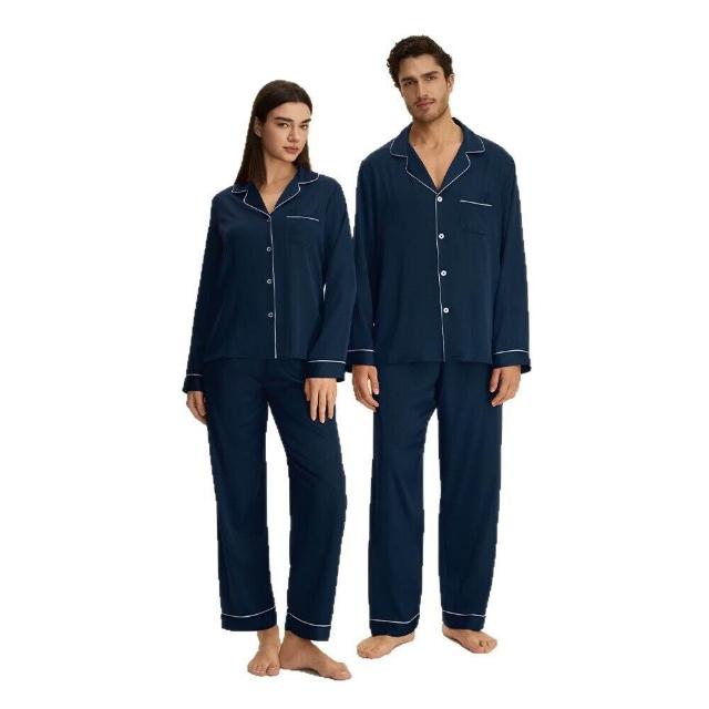 跨境情侶套裝秋歐美緞面休閑寬松純色舒適長款睡衣兩件套家居服