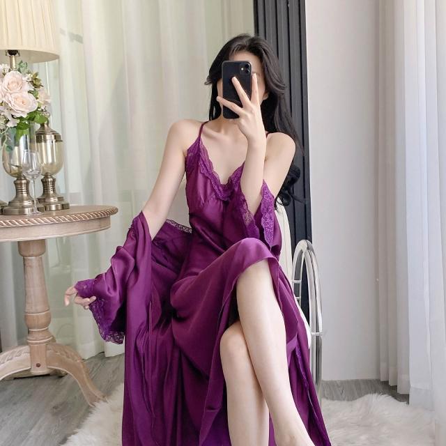 夏季新款性感長款吊帶裙睡袍兩件套 冰絲家居服女士V字領睡衣套裝