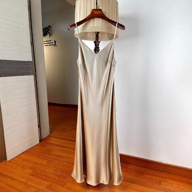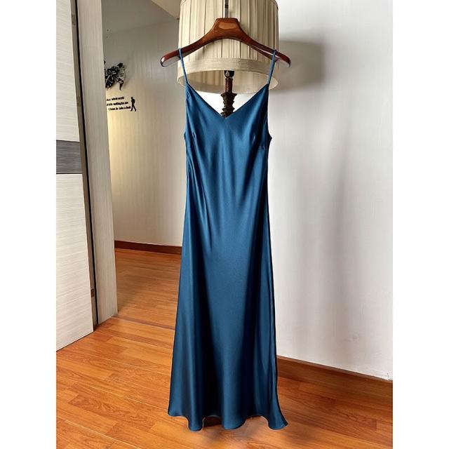 V領緞面醋酸真絲吊帶裙中長款 高級感內搭打底連衣裙夏薄款垂感