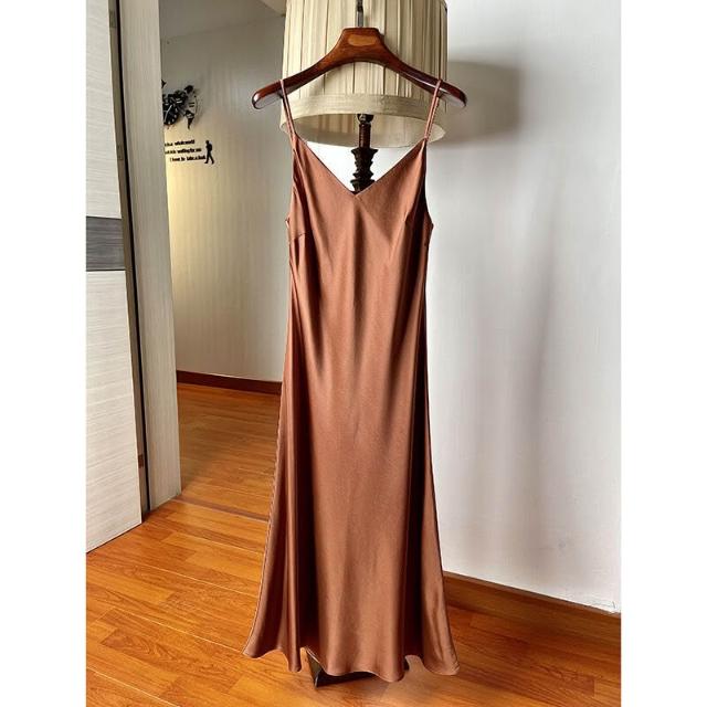 V領緞面醋酸真絲吊帶裙中長款 高級感內搭打底連衣裙夏薄款垂感