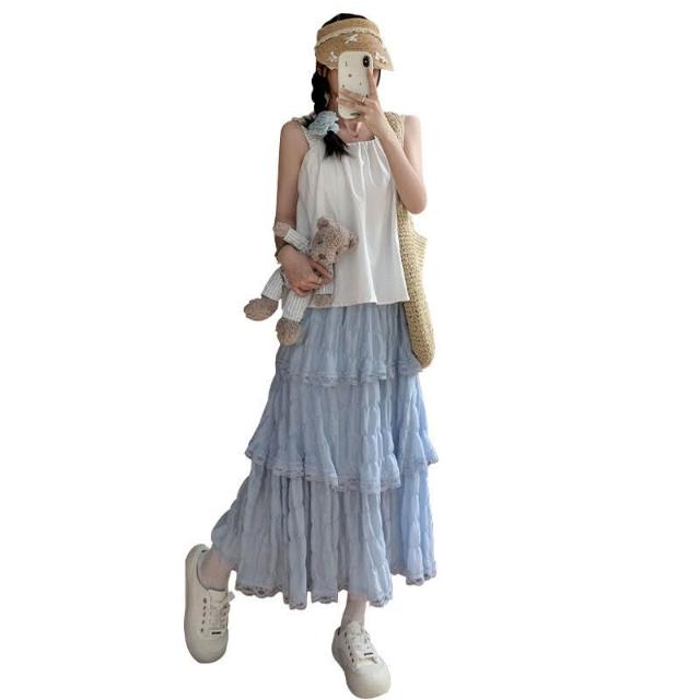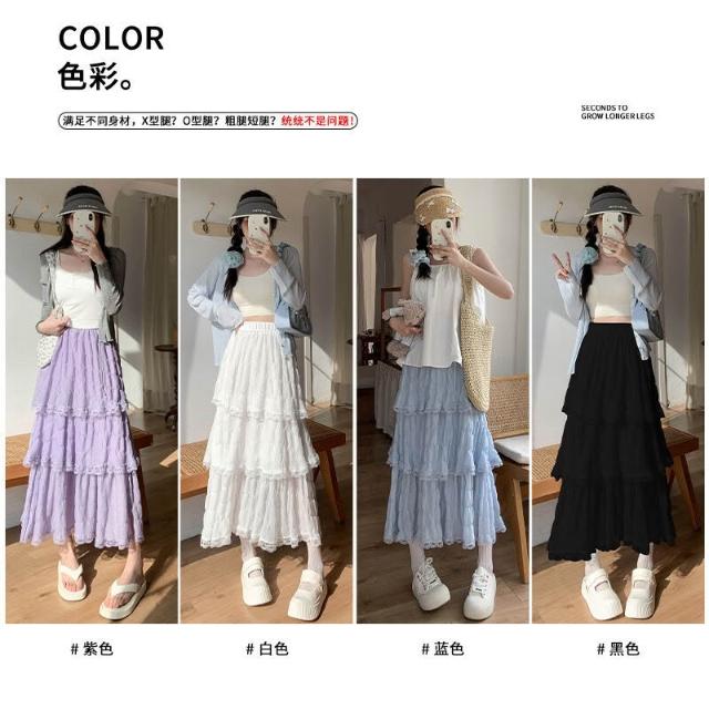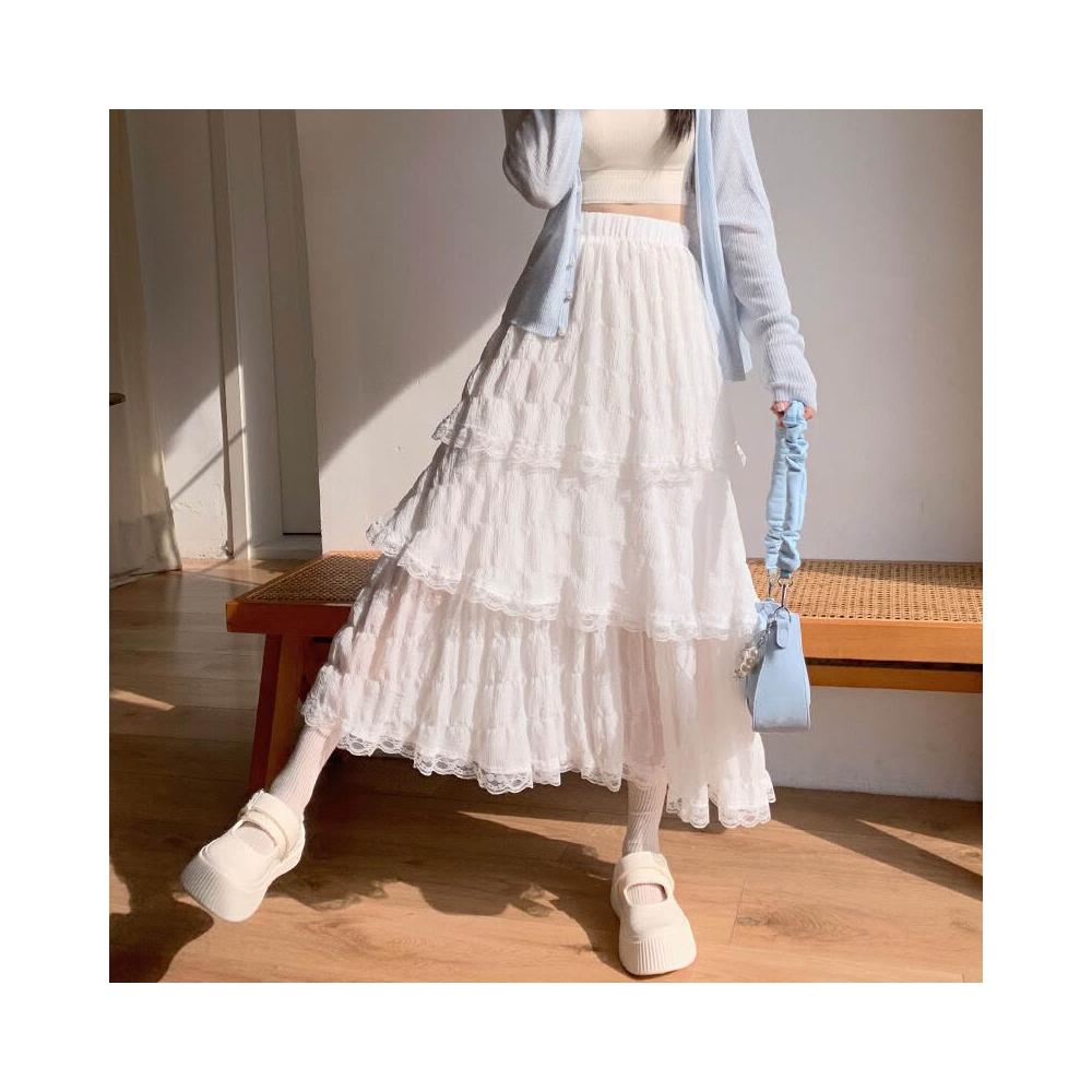 溫柔甜美蕾絲半身裙女高腰垂感A字蛋糕裙蓬蓬裙肌理感雪紡紗紗裙