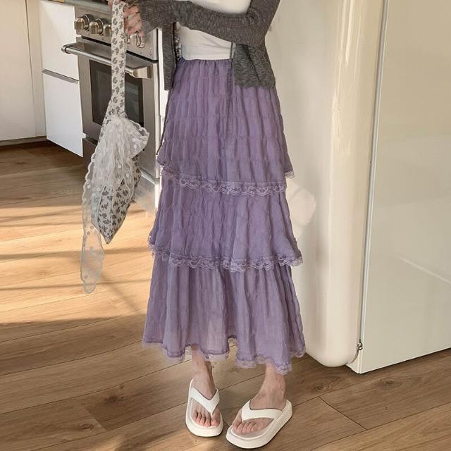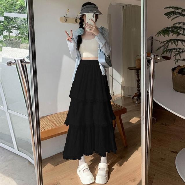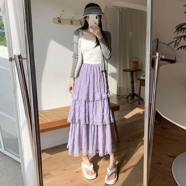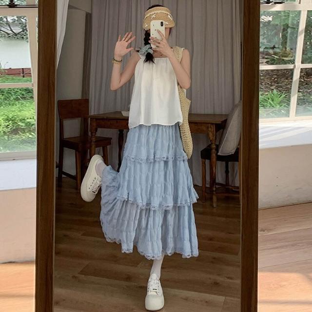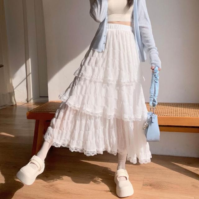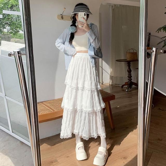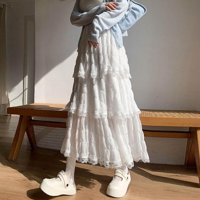 溫柔甜美蕾絲半身裙女高腰垂感A字蛋糕裙蓬蓬裙肌理感雪紡紗紗裙