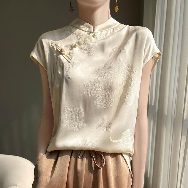 新中式時尚天絲短袖t恤女立領醋酸緞面提花上衣復古國風盤扣襯衫