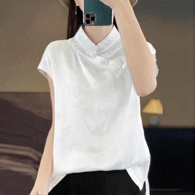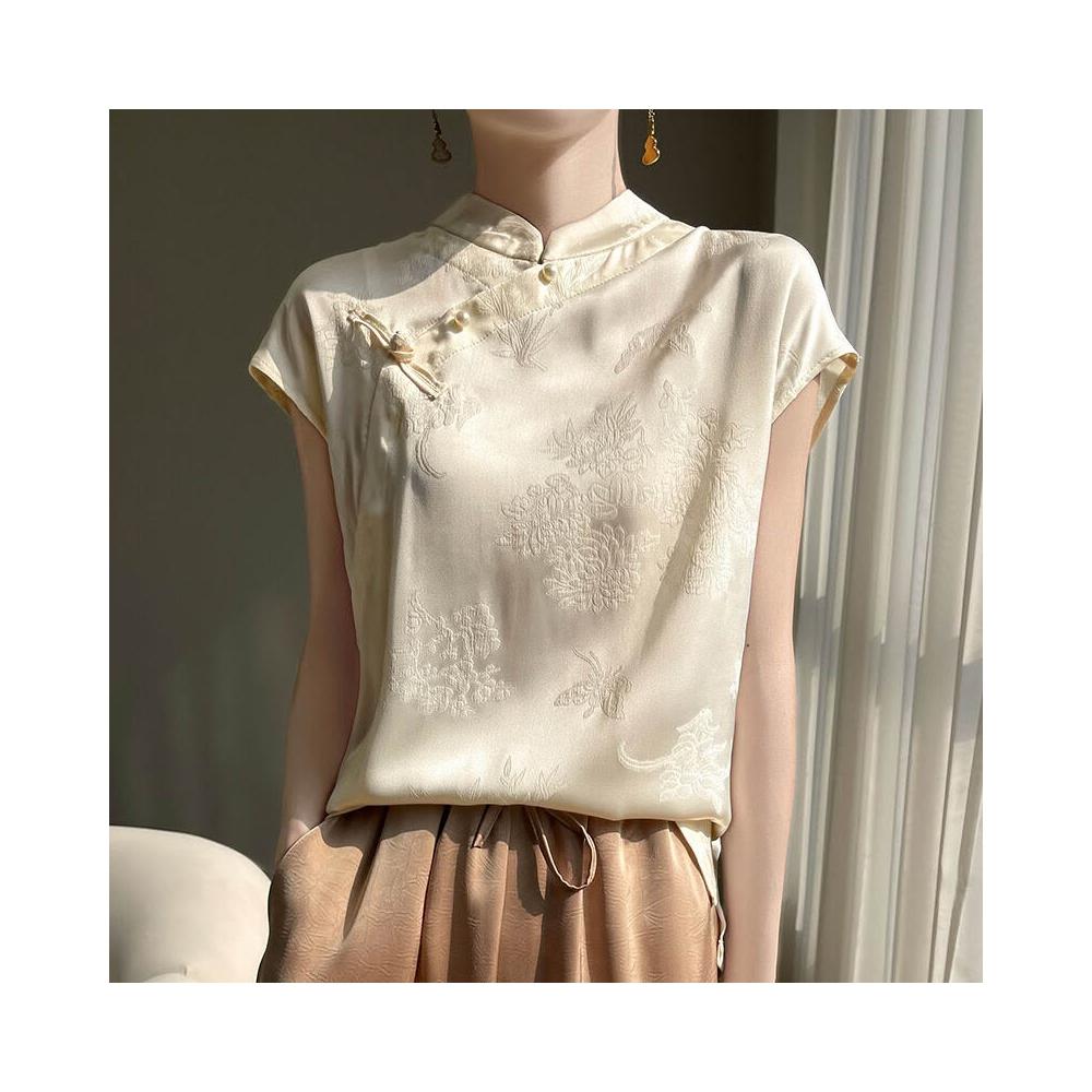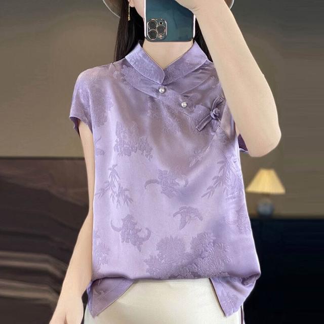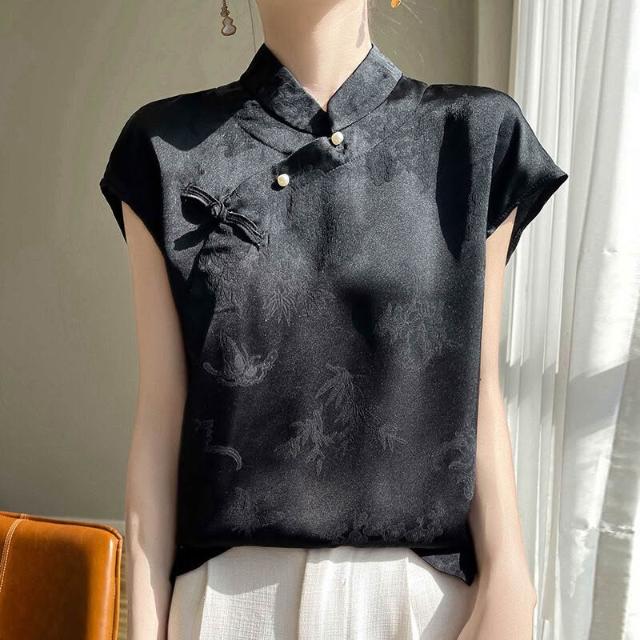 新中式時尚天絲短袖t恤女立領醋酸緞面提花上衣復古國風盤扣襯衫