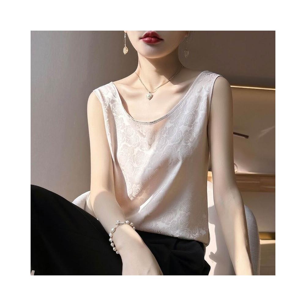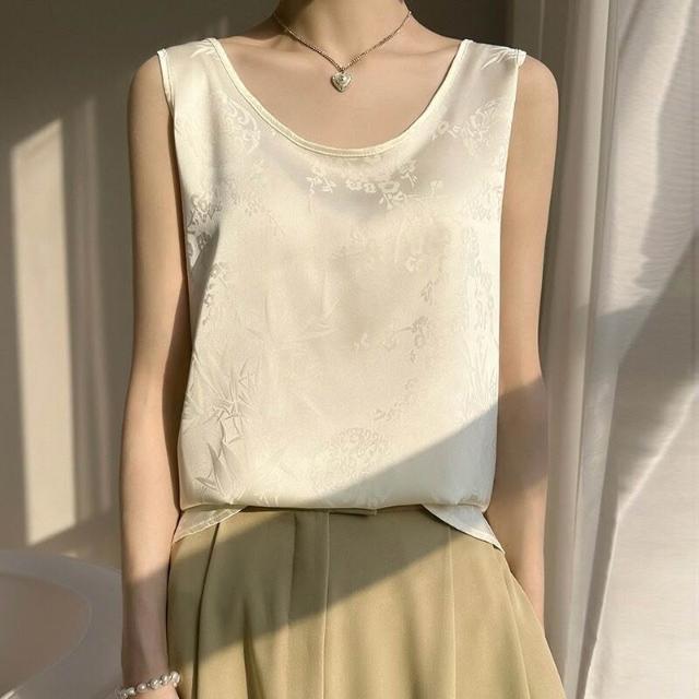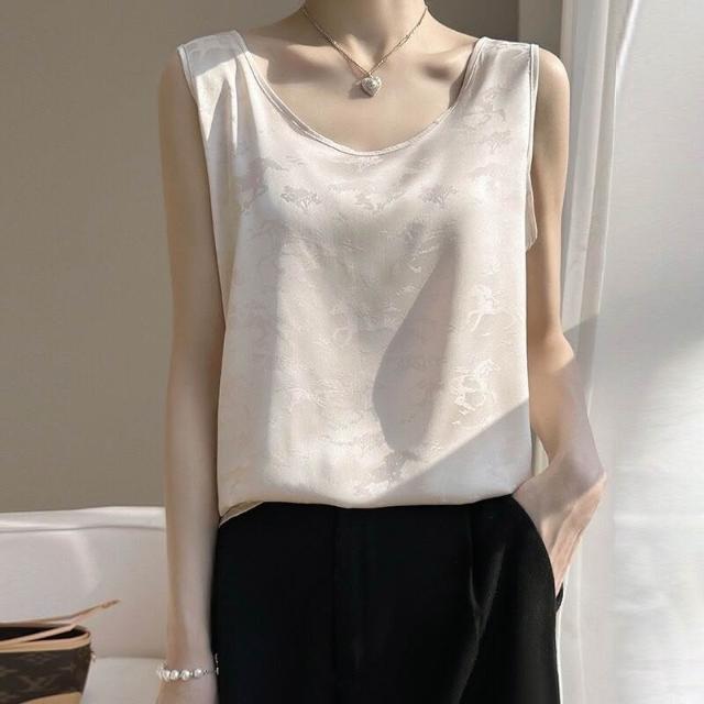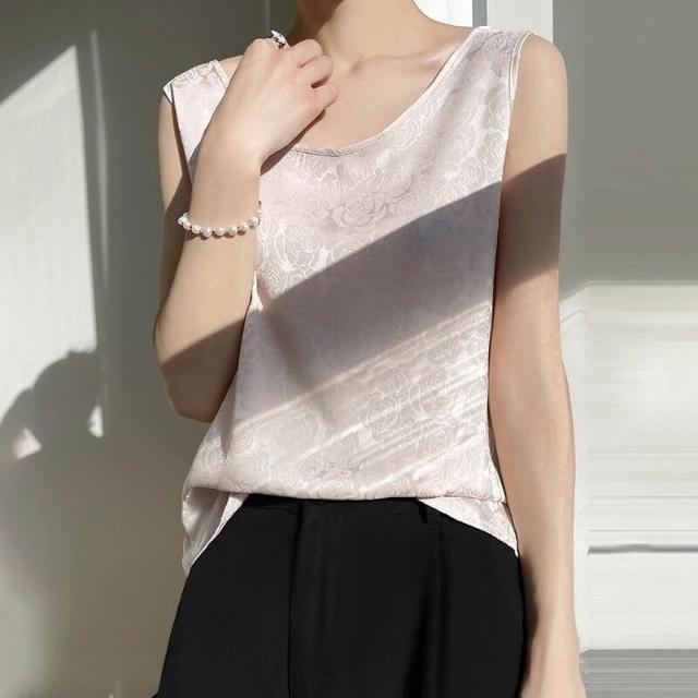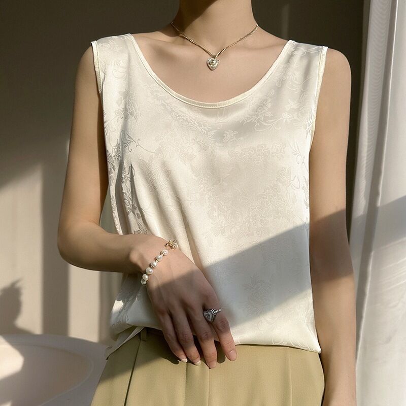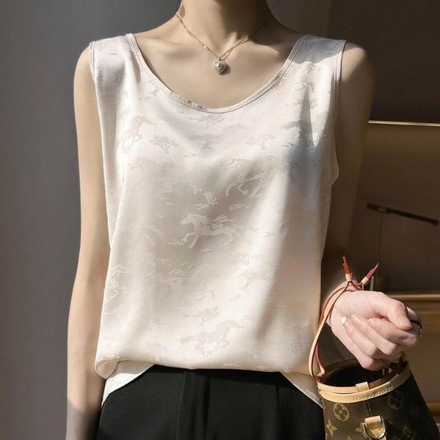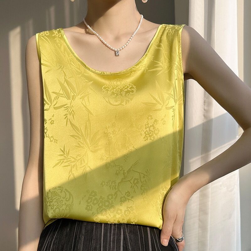 絲綢緞面2025春夏季新款女圓領寬肩帶套頭短款小背心印花吊帶上衣