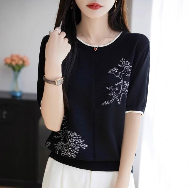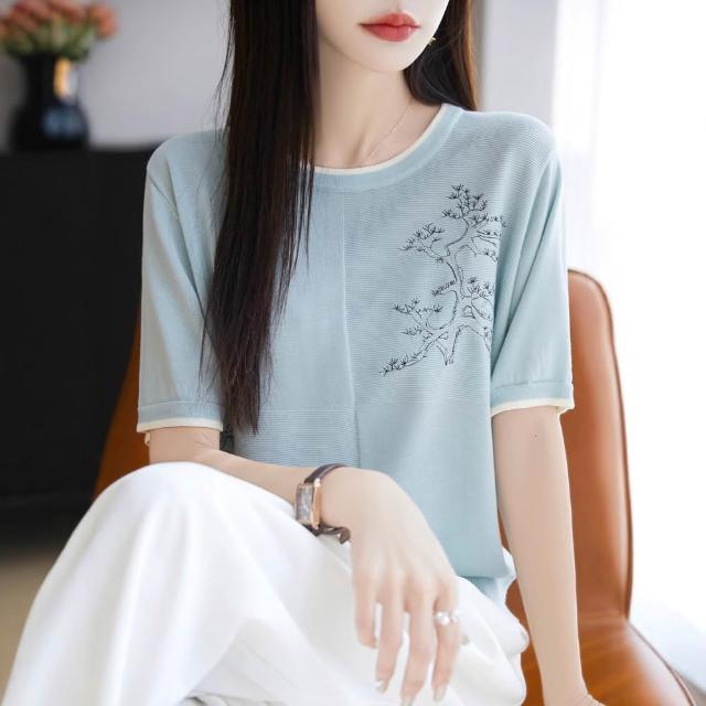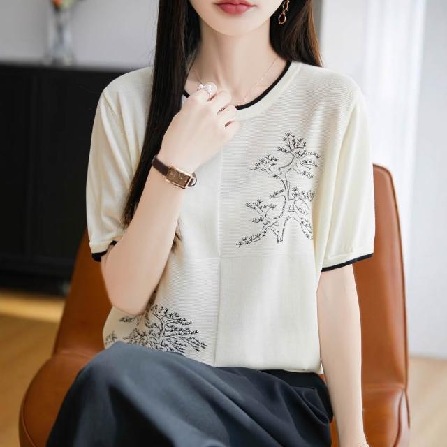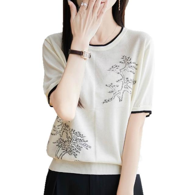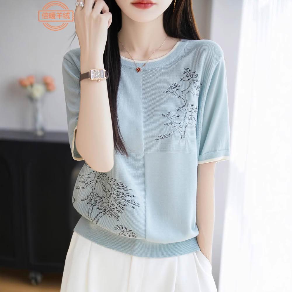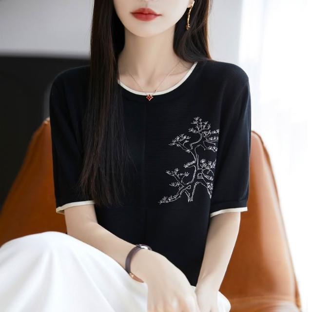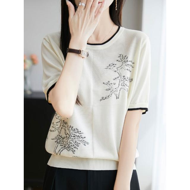 圓領萊賽爾天絲針織短袖女撞色國風繪畫T恤衫夏季新款薄體恤上衣