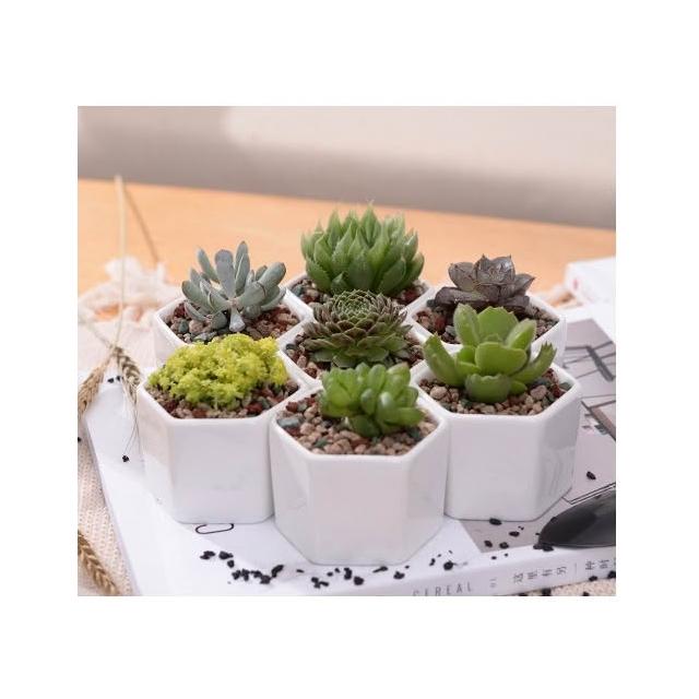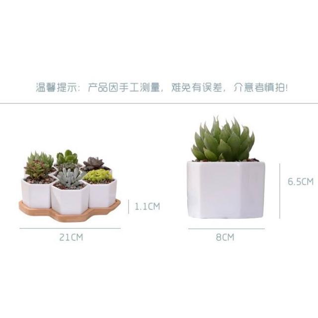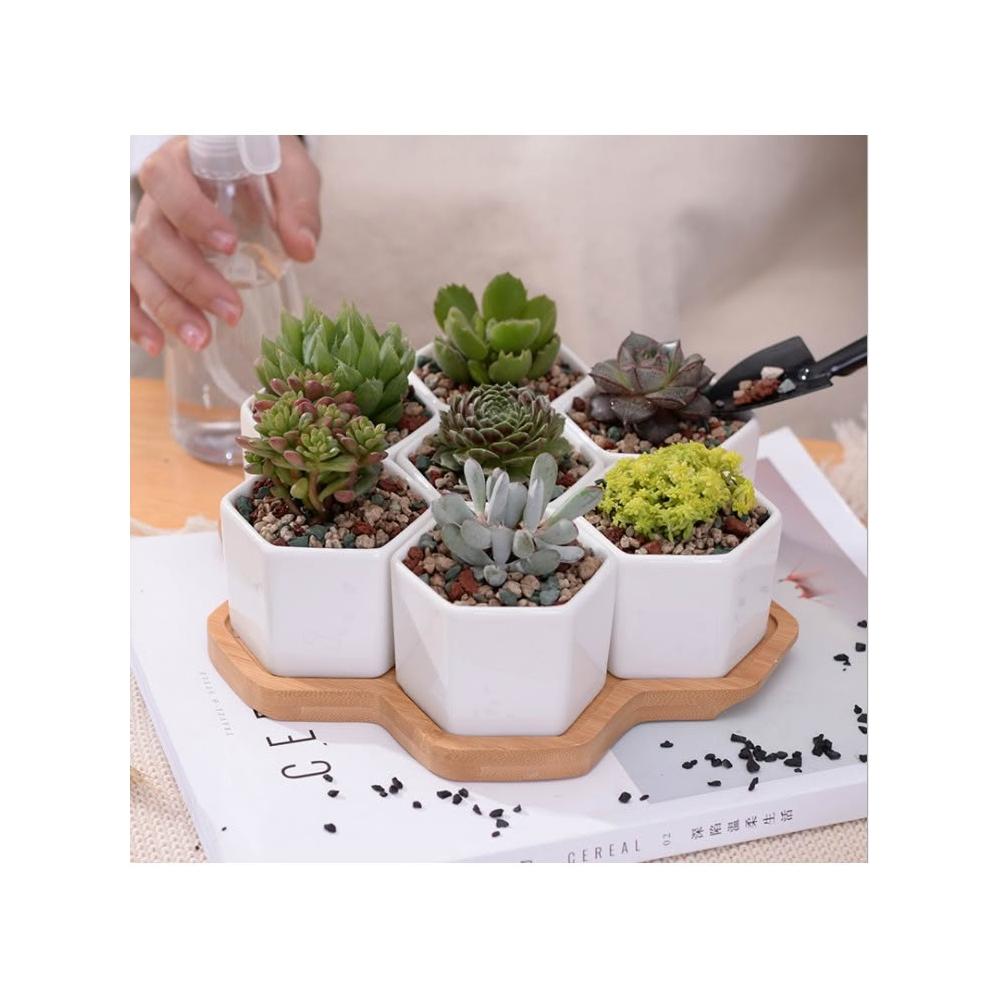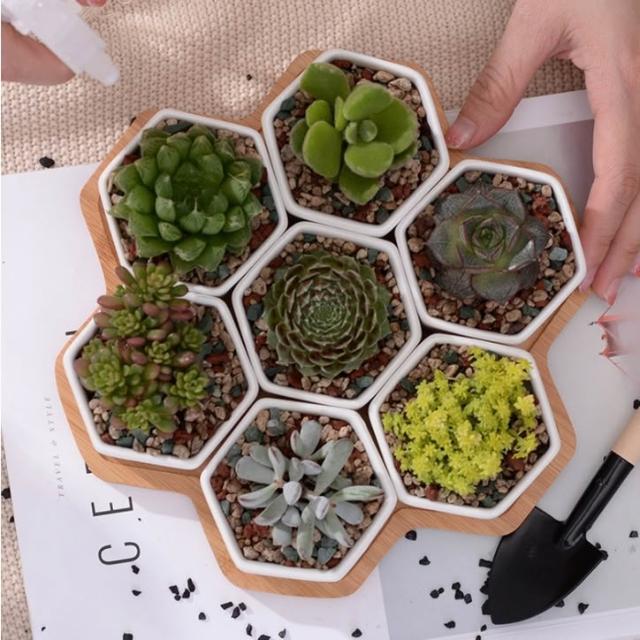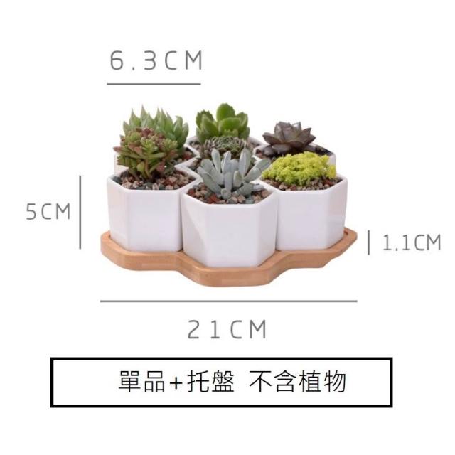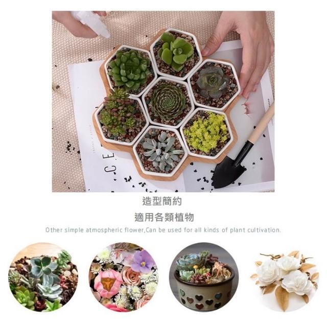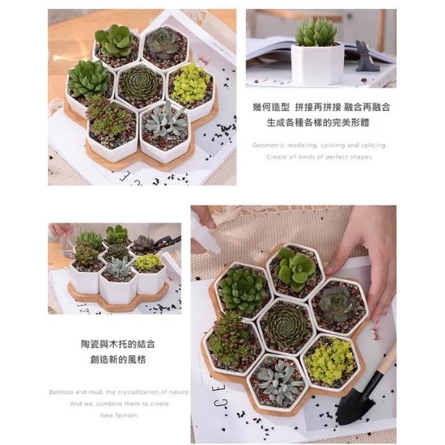巨路生活白色陶瓷花盆含竹托座 六邊形-一組7個花盆 白色創意陶瓷