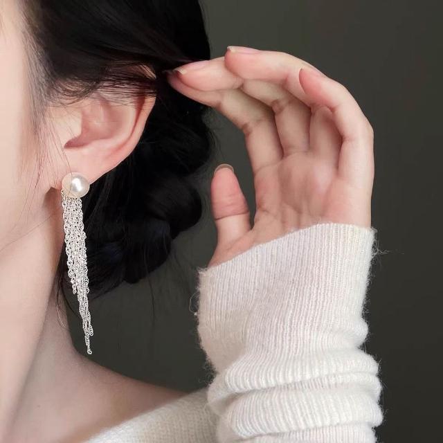 BG流行時尚新款耳環方圓臉珍珠長款流蘇耳飾女耳釘法式優雅輕奢小衆流蘇耳環