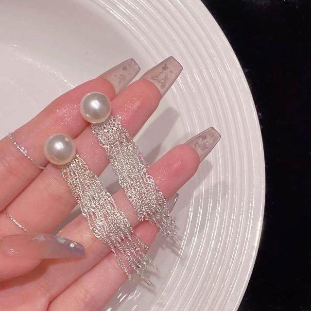 BG流行時尚新款耳環方圓臉珍珠長款流蘇耳飾女耳釘法式優雅輕奢小衆流蘇耳環